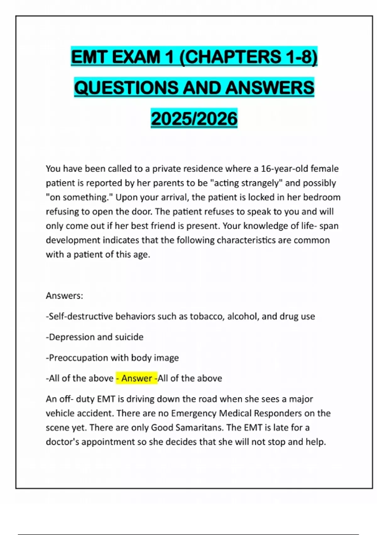 EMT EXAM 1 (CHAPTERS 1-8) QUESTIONS AND ANSWERS 2025/2026 You have been called to a private residence where a 16-year-old female patient is reported by her parents to be "acting strangely" and possibly "on something." Upon your arrival, the patient is locked in her bedroom refusing to open the door. The patient refuses to speak to you and will only come out if her best friend is present. Your knowledge of life- span development indicates that the following characteristics are common with a patient of this age. Answers: -Self-destructive behaviors such as tobacco, alcohol, and drug use -Depression and suicide -Preoccupation with body image -All of the above - Answer -All of the above An off- duty EMT is driving down the road when she sees a major vehicle accident. There are no Emergency Medical Responders on the scene yet. There are only Good Samaritans. The EMT is late for a doctor's appointment so she decides that she will not stop and help.The driver of the vehicle dies before help arrives. One of the Good Samaritans notices her EMT license plates and writes them down as she passes by. The Good Samaritan is angry that the EMT did not stop and help and tries to get the EMT fired for not helping. Which of the following statements is true? Answers: -The EMT is not negligent because she did not have a duty to act. -The EMT is negligent because the patient died. -The EMT is not negligent because she had a doctor's appointment. -The EMT is negligent for not stopping and helping. - Answer -The EMT is not negligent because she did not have a duty to act. Why is it important for EMTs to participate in quality improvement programs? Answers: -To ensure adequate personnel are available for emergencies -To identify problem employees and create a corrective action plan -To identify problems and develop a plan to prevent their recurrence -To ensure that individuals making false calls for EMS are prosecuted - Answer -To identify problems and develop a plan to prevent their recurrenceThe CDC recommends using an alcohol- based hand sanitizer in all except which of the following situation(s)? Answers: The provider's hands come into contact with fecal matter. The provider is not vaccinated against hepatitis B. The patient has a bloodborne communicable disease. The patient has a respiratory illness. - Answer -The