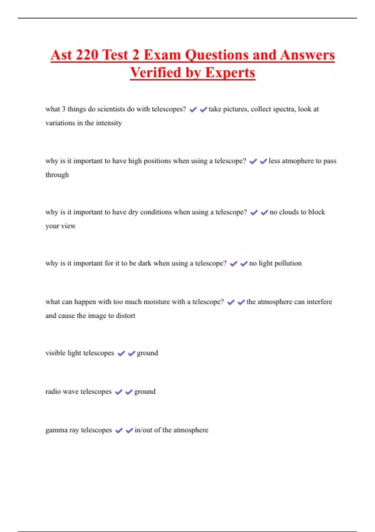 Ast 220 Test 2 Exam Questions and Answers Verified by Experts what 3 things do scientists do with telescopes? take pictures, collect spectra, look at variations in the intensity why is it important to have high positions when using a telescope? less atmophere to pass through why is it important to have dry conditions when using a telescope? no clouds to block your view why is it important for it to be dark when using a telescope? no light pollutio