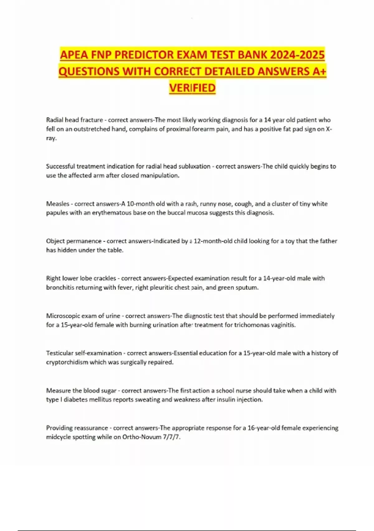 APEA FNP PREDICTOR EXAM TEST BANK QUESTIONS WITH CORRECT DETAILED ANSWERS A+ VERIFIED Radial head fracture - correct answers-The most likely working diagnosis for a 14 year old patient who fell on an outstretched hand, complains of proximal forearm pain, and has a positive fat pad sign on X-ray. Successful treatment indication for radial head subluxation - correct answers-The child quickly begins to use the affected arm after closed manipulation. Measles - correct answers-A 10-month old with a rash, runny nose, cough, and a cluster of tiny white papules with an erythematous base on the buccal mucosa suggests this diagnosis. Object permanence - correct answers-Indicated by a 12-month-old child looking for a toy that the father has hidden under the table.