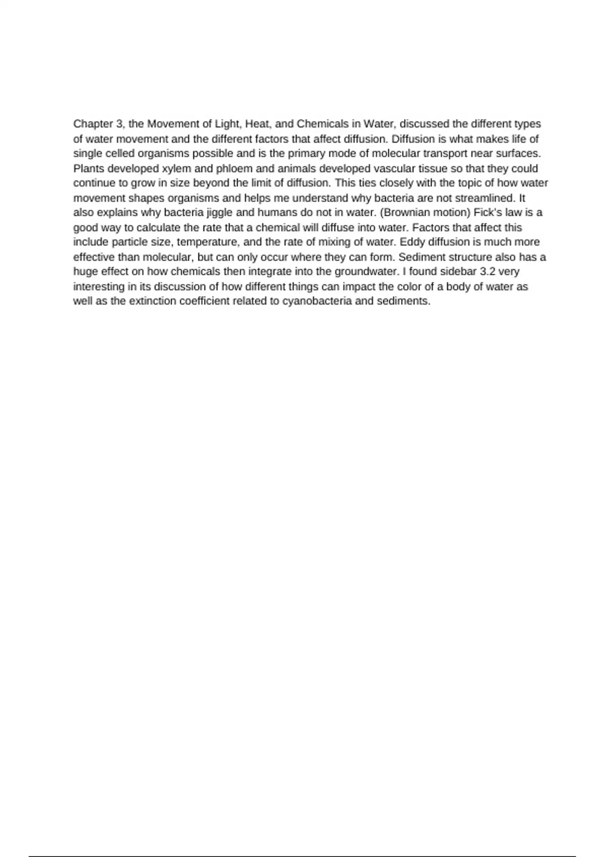 This chapter explores how light, heat, and chemicals move through water, emphasizing the importance of diffusion as a key transport mechanism at small scales. It explains how larger organisms evolved specialized tissues to overcome diffusion limits, contrasting with microorganisms that rely solely on it. The chapter also introduces Fick’s law to describe diffusion rates and discusses factors like particle size, temperature, and water mixing. Additionally, the role of sediment structure and eddy diffusion in chemical transport is covered. A notable sidebar examines how various factors affect water color and light attenuation, including cyanobacteria and sediments.