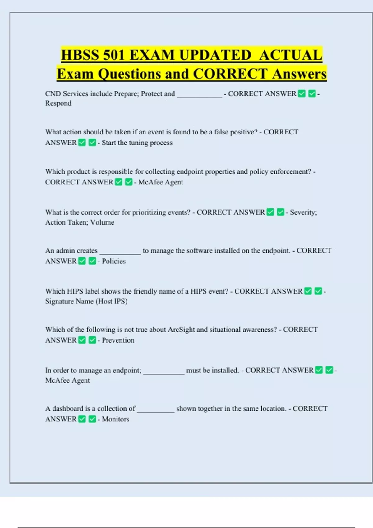 HBSS 501 EXAM UPDATED ACTUAL Exam Questions and CORRECT Answers CND Services include Prepare; Protect and ____________ - CORRECT ANSWER Respond What action should be taken if an event is found to be a false positive? - CORRECT ANSWER - Start the tuning process Which product is responsible for collecting endpoint properties and policy enforcement? - CORRECT ANSWER - McAfee Agent What is the correct order for prioritizing events? - CORRECT ANSWER Action Taken; Volume - Severity