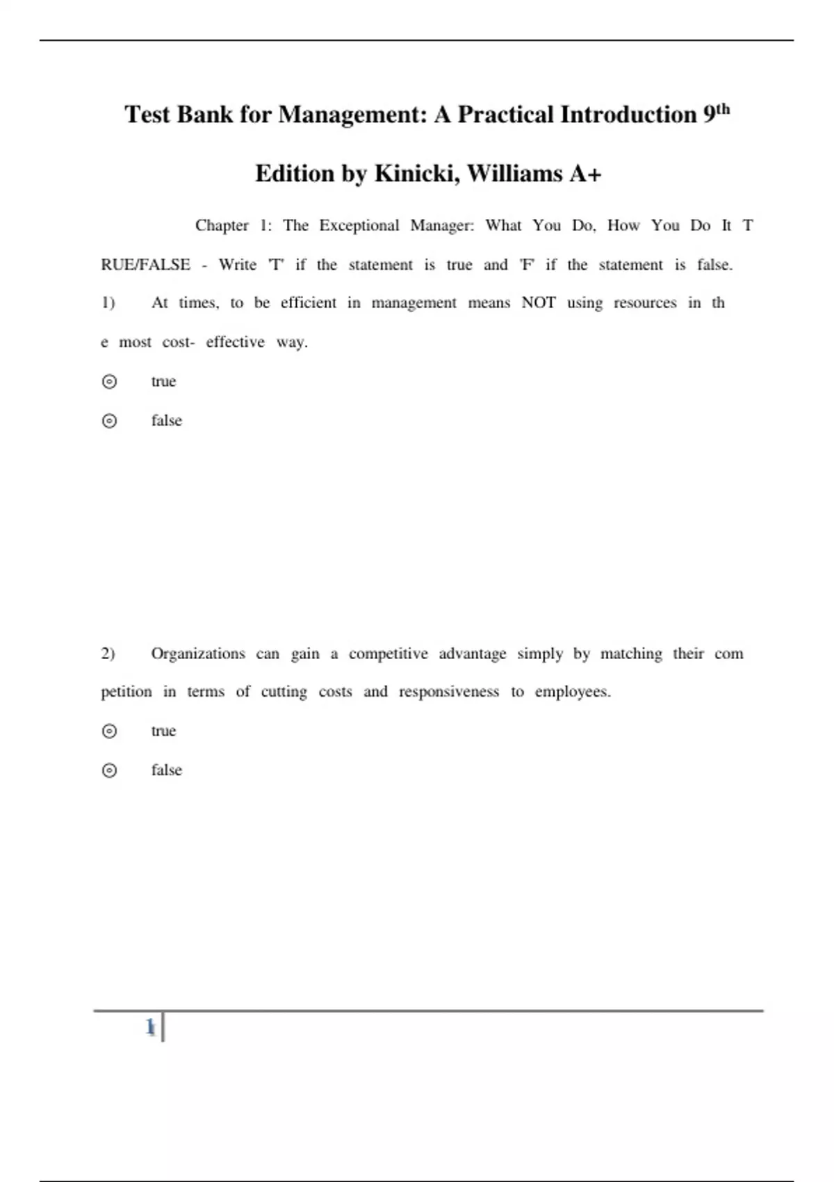 Test Bank for Management: A Practical Introduction 9th Edition by Kinicki, Williams A+