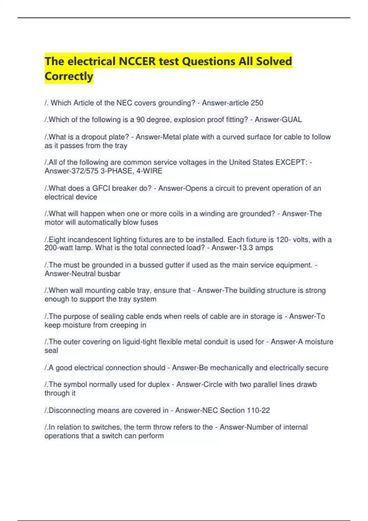 The electrical NCCER test Questions All Solved Correctly /. Which Article of the NEC covers grounding? - Answer-article 250 /.Which of the following is a 90 degree, explosion proof fitting? - Answer-GUAL /.What is a dropout plate? - Answer-Metal plate with a curved surface for cable to follow as it passes from the tray /.All of the following are common service voltages in the United States EXCEPT: - Answer-372/575 3-PHASE, 4-WIRE /.What does a GFCI breaker do? - Answer-Opens a circuit to prevent operation of an electrical device /.What will happen when one or more coils in a winding are grounded? - Answer-The motor will automatically blow fuses /.Eight incandescent lighting fixtures are to be installed. Each fixture is 120- volts, with a 200-watt lamp. What is the total connected load? - Answer-13.3 amps /.The must be grounded in a bussed gutter if used as the main service equipment. - Answer-Neutral busbar /.When wall mounting cable tray, ensure that - Answer-The building structure is strong enough to support the tray system /.The purpose of sealing cable ends when reels of cable are in storage is - Answer-To keep moisture from creeping in /.The outer covering on liguid-tight flexible metal conduit is used for - Answer-A moisture seal /.A good electrical connection should - Answer-Be mechanically and electrically secure /.The symbol normally used for duplex - Answer-Circle with two parallel lines drawb through it /.Disconnecting means are covered in - Answer-NEC Section 110-22 /.In relation to switches, the term throw refers to the - Answer-Number of internal operations that a switch can perform /.A 3-phase, 4-wire, 480v service requires ______ current transformer(s) - Answer-3 /.Services conductors and equipment are covered in - Answer-NEC Article 230 /.The NEC required that all receptacles installed on 25 amp and 20 amp branch circuits be ______ receptacles - Answer-Grounding /.A transformer with the primary of 400 turns and a secondary of 300 turns has a _____ - Answer-Step-down turns ratio of 4:3 /.The circular mil is based on the - Answer-Cross-sectional area of the wire /.Of the termination classes listed below, ____ is the only one that provides a seal against external elements. - Answer-Class 1 /.Unless otherwise noted. the calculations in AC circuits _____ values. - Answer-Rms /.When the coil turns are increased the _____ - Answer-Induced voltage is increased /.As the temperature surrounding a self-regulating heating cable rises, the ____ - Answer-Resistance of the polymeric core increases /.The motor type that has the highest starting torque is the ____ motor. - Answer-Capacitor-start /.For a given number of poles, the ____ determines the speed of an AC motor. - Answer-Frequency /.Both induction and synchronous motors operate on the principle of a rotating ____ field - Answer-Magnetic /.A transformer has 200 turns in the primary, 150 turns in the secondary, and 120VAC applied to the primary. The voltage across the secondary is: - Answer-90Volts /.The output capacity of a motor is rated in - Answer-Horsepower /.The synchronous speed at which a pole, 60 Hz induction motor operates is rpm. - Answer-1,800 /.The sine of 0 degree is - Answer-0 /.Meters used in AC circuits indicate the - Answer-Effective /.The component labeled 7 in figure 1 is a(n) - Answer-End seal /.In an AC circuit containing resistance only _____ will flow if the resistance is 10 ohms and the voltage is 120V. - Answer-12A /.The _____ rotor types are generally rugged. - Answer-Squirrel cage /.Proofs tests are made at_ of the original factory voltage. - Answer-60% /.Which type of heating cable cannot be cut and terminated in the field? - Answer-Mineral insulated /.The secondary of a CT under load should not be opened because of_. - Answer-Induced high voltage /.In a transformer ______ - Answer-Electromagnetic Induction Ocurs /.When a ground rod is installed, the top of the rod must be positioned ______ grade. - Answer-Flush with or below /.When making offset bends, the two kicks must be made perfectly parallel or the resulting offset will have a _____ - Answer-Crooked Bend /.conduit that requires a 90 degree change in direction, except 42.All of the following types of condulet may be used as a pulling point for _____ - Answer-C /.To be effective, a grounding system must limit the voltage on the electrical system and protect it from all of the following, except _____ - Answer-Undervoltage conditions /.What is the MOST common service used in a temporary power panel? - Answer-120/240 volt, 1-phase, 3-wire /.What are the 2 MOST common types of overcurrent protective devices? - Answer-Circuit breakers and fuses /.What instrument is used to perform an insulation-resistance test on a 480- volt motor winding? - Answer-Megohmmeter /.Why is a seal installed in a run of conduit in a Class I location? - Answer-Prevent the passage of explosive gases in the conduit /.Which of the following is the correct formula for OHM's law? - Answer-I=E/R /.Which of the following testing instruments operated on the current transformer principle? - Answer-Clamp-on ammeter