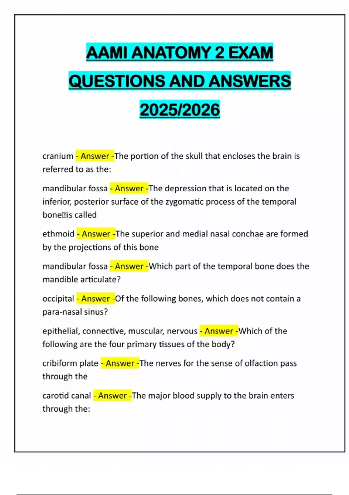 AAMI ANATOMY 2 EXAM QUESTIONS AND ANSWERS 2025/2026 cranium - Answer -The portion of the skull that encloses the brain is referred to as the: mandibular fossa - Answer -The depression that is located on the inferior, posterior surface of the zygomatic process of the temporal bone�is called ethmoid - Answer -The superior and medial nasal conchae are formed by the projections of this bone mandibular fossa - Answer -Which part of the temporal bone does the mandible articulate? occipital - Answer -Of the following bones, which does not contain a para-nasal sinus? epithelial, connective, muscular, nervous - Answer -Which of the following are the four primary tissues of the body? cribiform plate - Answer -The nerves for the sense of olfaction pass through the carotid canal - Answer -The major blood supply to the brain enters through the:sternum, ribs, auditory ossicles - Answer -Of the following bones, which belong to the axial skeleton? hyaline - Answer -The most abundant cartilage in the body is: occipital condyle - Answer -Superiorly, the atlas articulates with the petrous portion of the temporal bone - Answer -The auditory ossicles are contained within the: parietal & occipital bones - Answer -The lambdoidal suture is found between: medullary canal - Answer -The hollow chamber that runs the length of the diaphysis of a long bone: abdomen - Answer -The area between the diaphragm and pelvis is referred to as the incus - Answer -The auditory ossicle shaped like an anvil 206 - Answer -How many bones are there in the adult human skeleton? zygomatic process of the temporal bone/temporal process of the zygomatic bone - Answer -The zygomatic arch is formed by the: magnum - Answer -The opening located in the inferior part of the occipital bone is called the foraman: sella turcica - Answer -Which of the following, houses the hypophysis? ethmoid - Answer -The light spongy bone located in the anterior part of the floor of the cranium between the orbits is: perpendicular plate of the ethmoid bone - Answer -Which of the following forms the superior portion of the nasal septum?frontal eminences - Answer -The two rounded prominences located at the upper part of the forehead are called: supra orbital margin - Answer -These lie inferior to the superciliary arches and are the upper rim of the eye sockets: mediastinum, pleura cavity, pericardial cavity - Answer -Which of the following are the three subdivisions of the thoracic cavity? it is an irregular bone that lies anterior to the sphenoid bone but posterior to the nasal bones - Answer -Which of the following is a tr