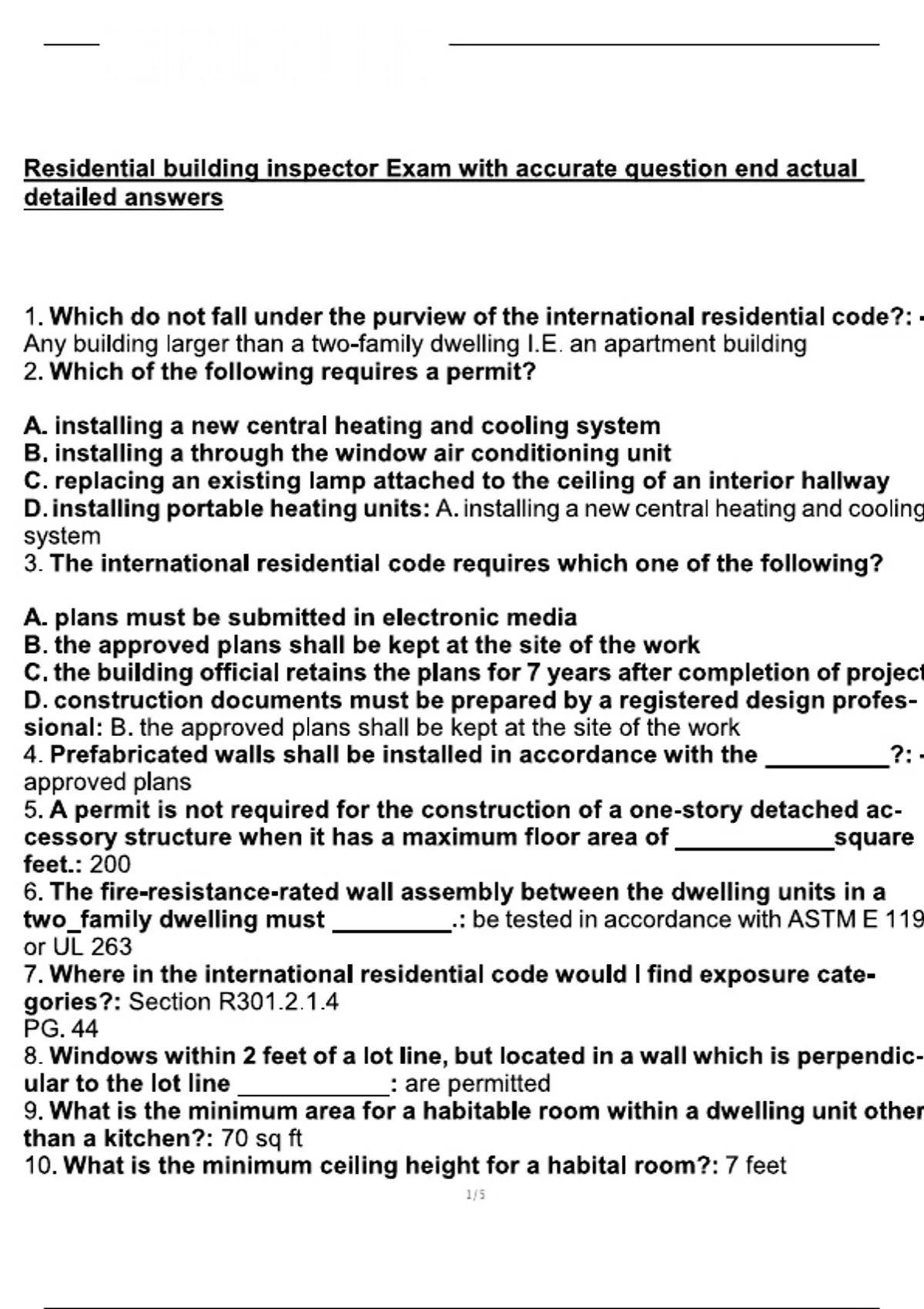 Residential building inspector Exam with accurate question end actual detailed answers 1. Which do not fall under the purview of the international residential code?: - Any building larger than a two-family dwelling I.E. an apartment building 2. Which of the following requires a permit? A. installing a new central heating and cooling system B. installing a through the window air conditioning unit C. replacing an existing lamp attached to the ceiling of an interior hallway D. installing portable heating units: A. installing a new central heating and cooling system 3. The international residential code requires which one of the following? A. plans must be submitted in electronic media B. the approved plans shall be kept at the site of the work C. the building official retains the plans for 7 years after completion of project D. construction documents must be prepared by a registered design profes- sional: B. the approved plans shall be kept at the site of the work