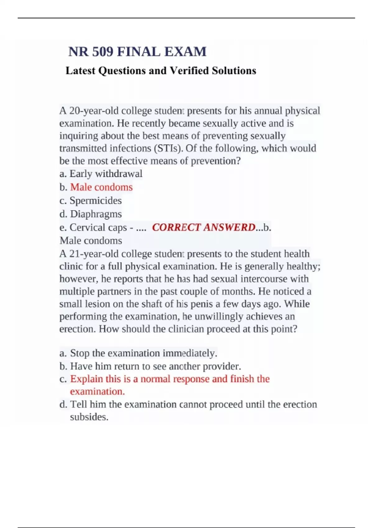 NR 509 FINAL EXAM with Latest Questions and Verified Answers A 20-year-old college student presents for his annual physical examination. He recently became sexually active and is inquiring about the best means of preventing sexually transmitted infections (STIs). Of the following, which would be the most effective means of prevention? a. Early withdrawal b. Male condoms c. Spermicides d. Diaphragms e. Cervical caps - .... CORRECT ANSWERD...b. Male condoms A 21-year-old college student presents to the student health clinic for a full physical examination. He is generally healthy; however, he reports that he has had sexual intercourse with multiple partners in the past couple of months. He noticed a small lesion on the shaft of his penis a few days ago. While performing the examination, he unwillingly achieves an erection. How should the clinician proceed at this point? a. Stop the examination immediately. b. Have him return to see another provider. c. Explain this is a normal response and finish the examination. d. Tell him the examination cannot proceed until the erection subsides.