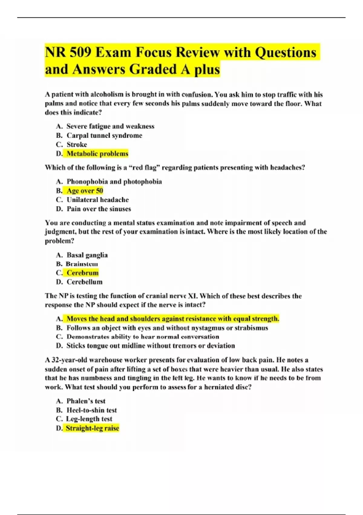 NR 509 Exam Focus Review with Questions and Answers Graded A plus A patient with alcoholism is brought in with confusion. You ask him to stop traffic with his palms and notice that every few seconds his palms suddenly move toward the floor. What does this indicate? A. Severe fatigue and weakness B. Carpal tunnel syndrome C. Stroke D. Metabolic problems Which of the following is a “red flag” regarding patients presenting with headaches? A. Phonophobia and photophobia B. Age over 50 C. Unilateral headache D. Pain over the sinuses You are conducting a mental status examination and note impairment of speech and judgment, but the rest of your examination is intact. Where is the most likely location of the problem? A. Basal ganglia B. Brainstem C. Cerebrum D. Cerebellum The NP is testing the function of cranial nerve XI. Which of these best describes the response the NP should expect if the nerve is intact? A. Moves the head and shoulders against resistance with equal strength. B. Follows an object with eyes and without nystagmus or strabismus C. Demonstrates ability to hear normal conversation D. Sticks tongue out midline without tremors or deviation A 32-year-old warehouse worker presents for evaluation of low back pain. He notes a sudden onset of pain after lifting a set of boxes that were heavier than usual. He also states that he has numbness and tingling in the left leg. He wants to know if he needs to be from work. What test should you perform to assess for a herniated disc? A. Phalen’s test B. Heel-to-shin test C. Leg-length test D. Straight-leg raise