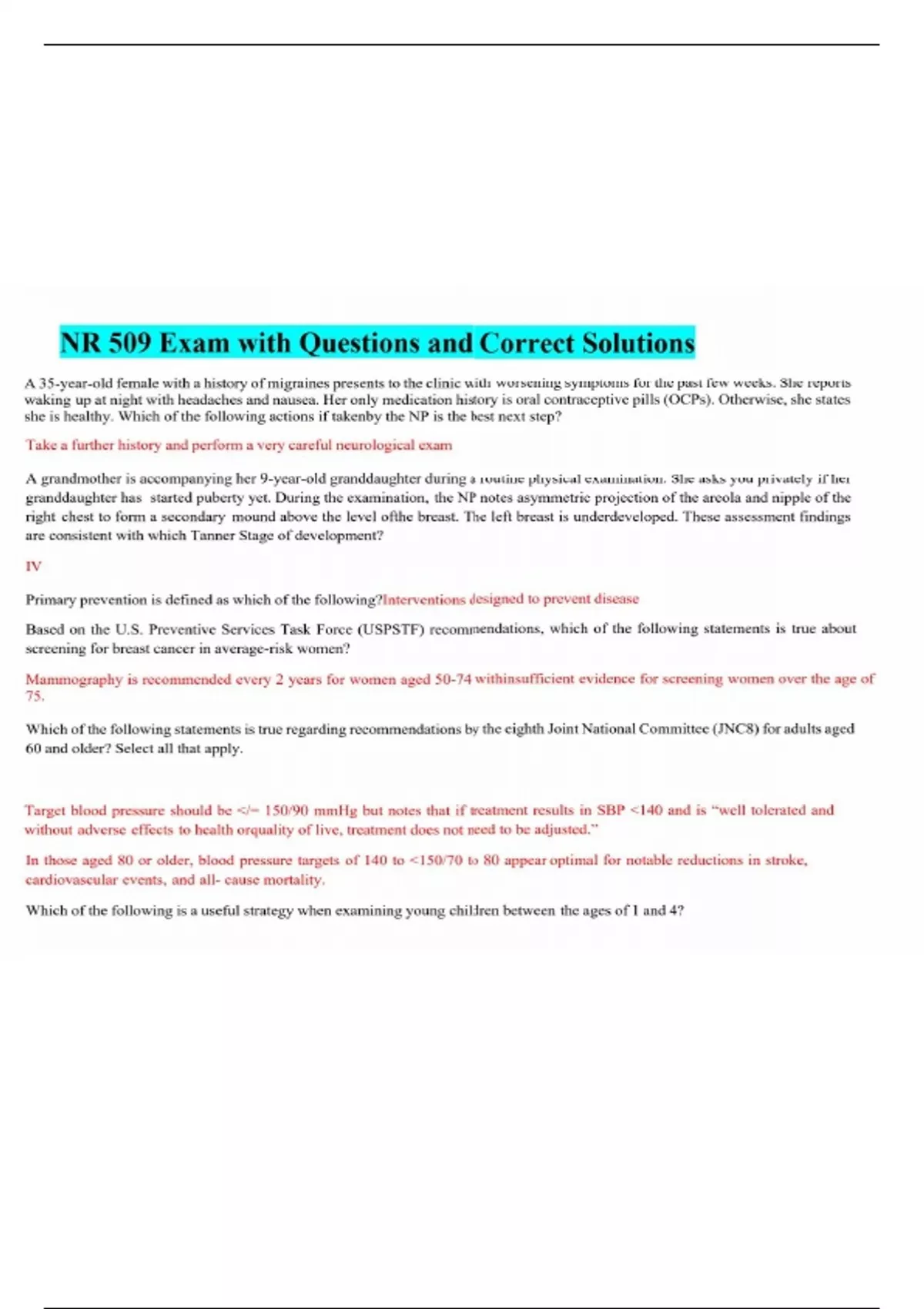 NR 509 Exam with Questions and Correct Solutions A 35-year-old female with a history of migraines presents to the clinic with worsening symptoms for the past few weeks. She reports waking up at night with headaches and nausea. Her only medication history is oral contraceptive pills (OCPs). Otherwise, she states she is healthy. Which of the following actions if takenby the NP is the best next step? Take a further history and perform a very careful neurological exam A grandmother is accompanying her 9-year-old granddaughter during a routine physical examination. She asks you privately if her granddaughter has started puberty yet. During the examination, the NP notes asymmetric projection of the areola and nipple of the right chest to form a secondary mound above the level ofthe breast. The left breast is underdeveloped. These assessment findings are consistent with which Tanner Stage of development? IV Primary prevention is defined as which of the following?Interventions designed to prevent disease Based on the U.S. Preventive Services Task Force (USPSTF) recommendations, which of the following statements is true about screening for breast cancer in average-risk women? Mammography is recommended every 2 years for women aged 50-74 withinsufficient evidence for screening women over the age of 75. Which of the following statements is true regarding recommendations by the eighth Joint National Committee (JNC8) for adults aged 60 and older? Select all that apply. Target blood pressure should be </= 150/90 mmHg but notes that if treatment results in SBP <140 and is “well tolerated and without adverse effects to health orquality of live, treatment does not need to be adjusted.” In those aged 80 or older, blood pressure targets of 140 to <150/70 to 80 appear optimal for notable reductions in stroke, cardiovascular events, and all- cause mortality. Which of the following is a useful strategy when examining young children between the ages of 1 and 4?