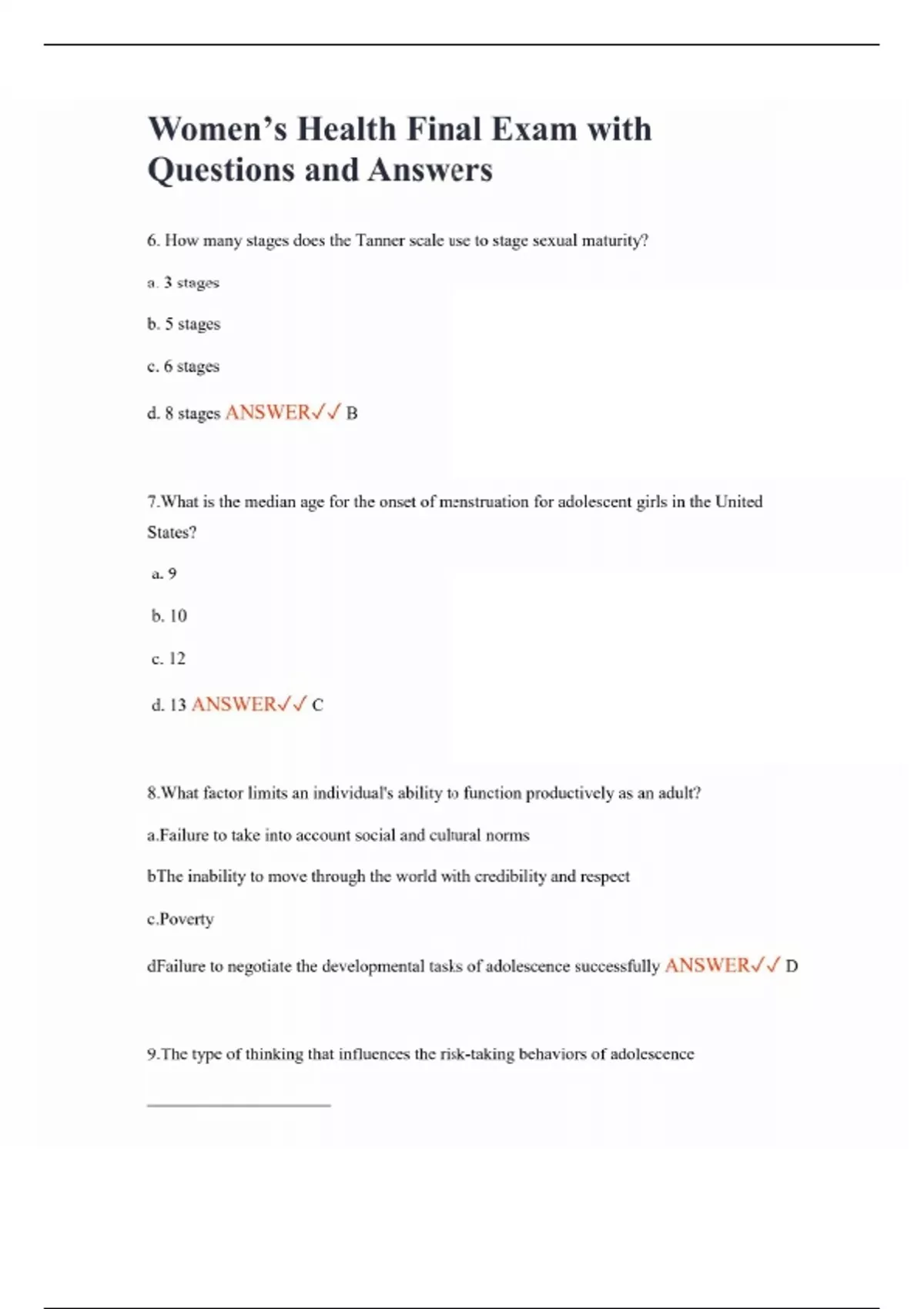 Women’s Health Final Exam with Questions and Answers 6. How many stages does the Tanner scale use to stage sexual maturity? a. 3 stages b. 5 stages c. 6 stages d. 8 stages ANSWER B 7.What is the median age for the onset of menstruation for adolescent girls in the United States? a. 9 b. 10 c. 12 d. 13 ANSWER C 8.What factor limits an individual's ability to function productively as an adult? a.Failure to take into account social and cultural norms bThe inability to move through the world with credibility and respect c.Poverty dFailure to negotiate the developmental tasks of adolescence successfully ANSWER D 9.The type of thinking that influences the risk-taking behaviors of adolescence