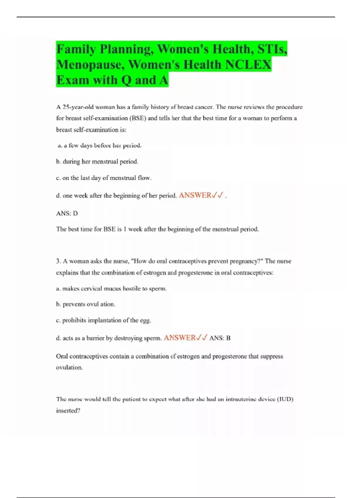Family Planning, Women's Health, STIs, Menopause, Women's Health NCLEX Exam with Q and A A 25-year-old woman has a family history of breast cancer. The nurse reviews the procedure for breast self-examination (BSE) and tells her that the best time for a woman to perform a breast self-examination is: a. a few days before her period. b. during her menstrual period. c. on the last day of menstrual flow. d. one week after the beginning of her period. ANSWER . ANS: D The best time for BSE is 1 week after the beginning of the menstrual period. 3. A woman asks the nurse, "How do oral contraceptives prevent pregnancy?" The nurse explains that the combination of estrogen and progesterone in oral contraceptives: a. makes cervical mucus hostile to sperm. b. prevents ovul ation. c. prohibits implantation of the egg. d. acts as a barrier by destroying sperm. ANSWER ANS: B Oral contraceptives contain a combination of estrogen and progesterone that suppress ovulation.