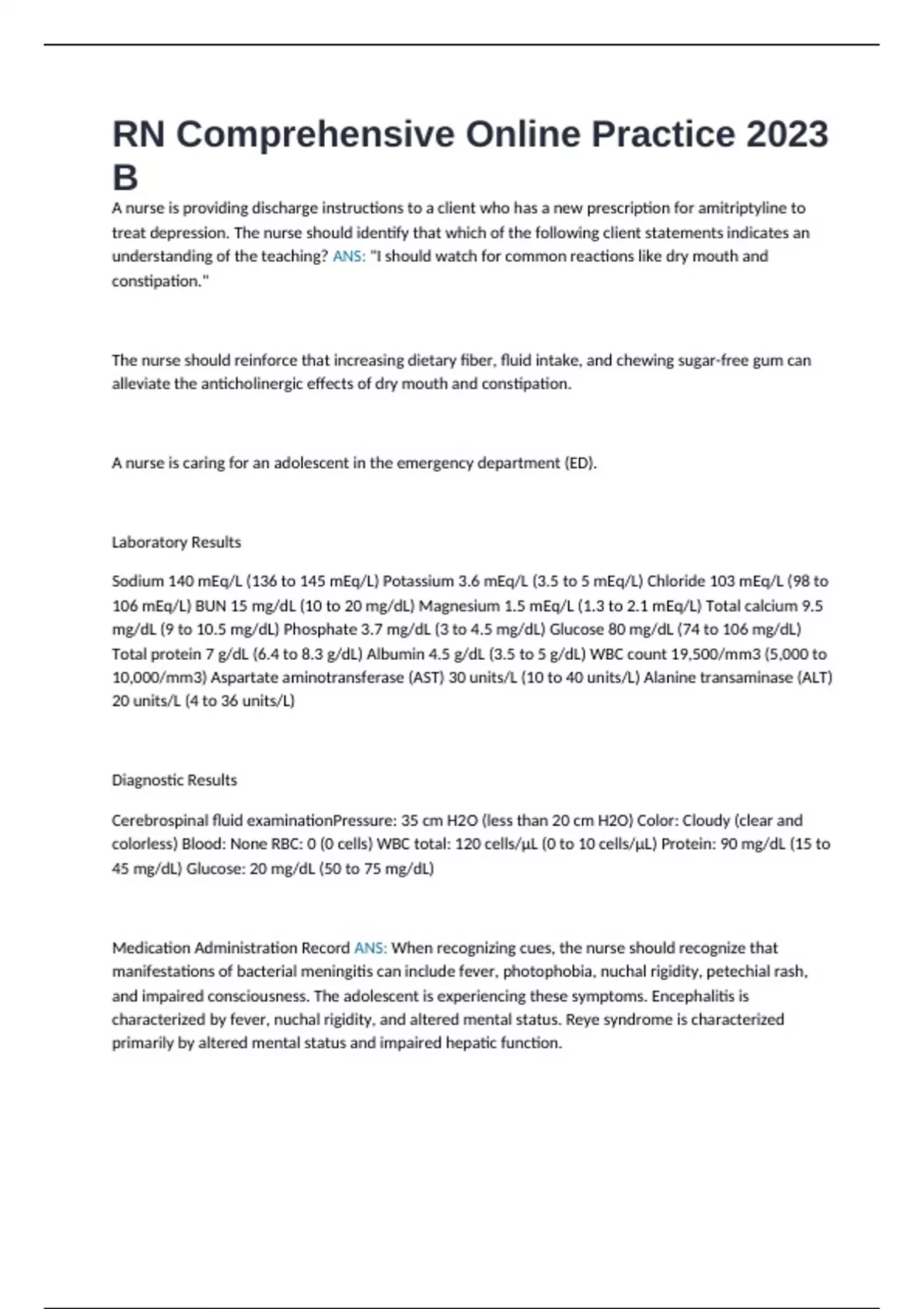 Total protein 7 g/dL (6.4 to 8.3 g/dL) Albumin 4.5 g/dL (3.5 to 5 g/dL) WBC count 19,500/mm3 (5,000 to