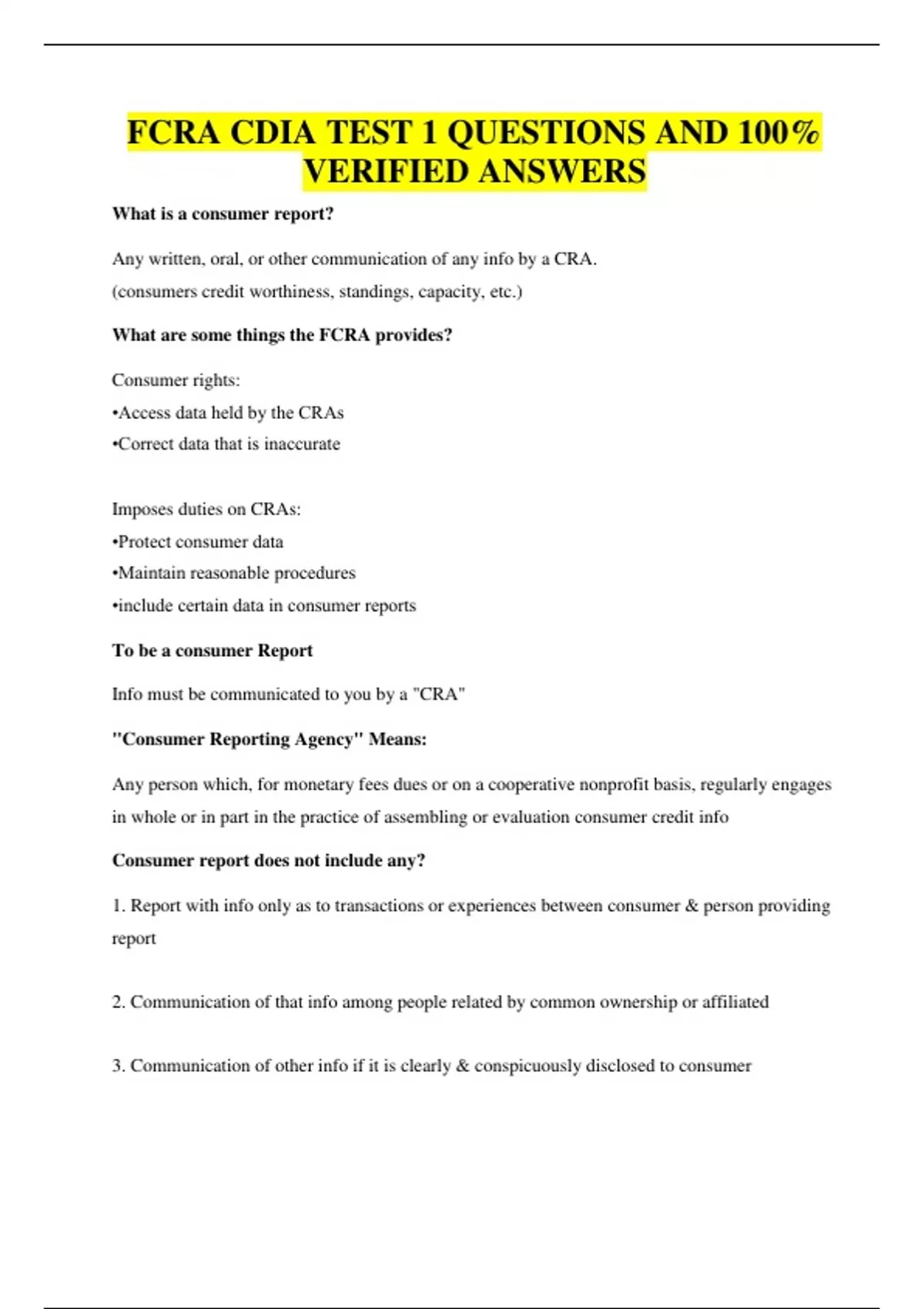 FCRA CDIA TEST 1 QUESTIONS AND 100%