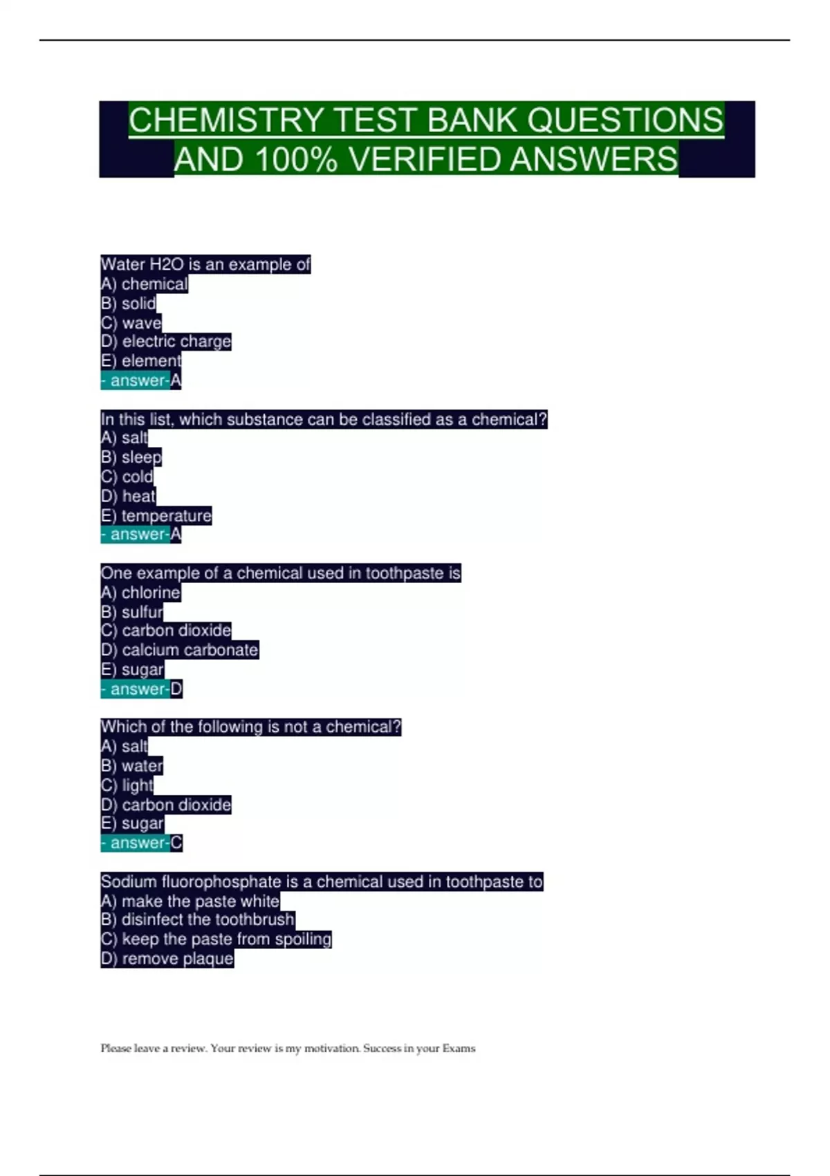 CHEMISTRY 101: Comprehensive Test Bank with 100% Verified Answers – Study Guide & Practice Questions
