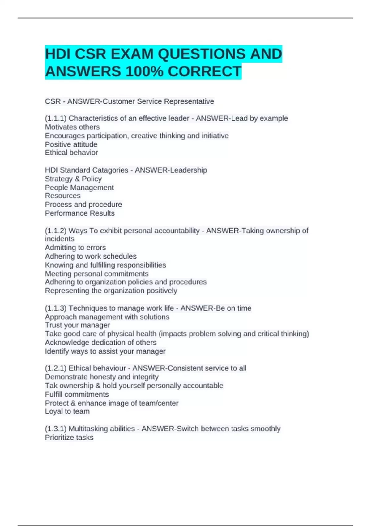 HDI Standard Catagories - ANSWER-Leadership