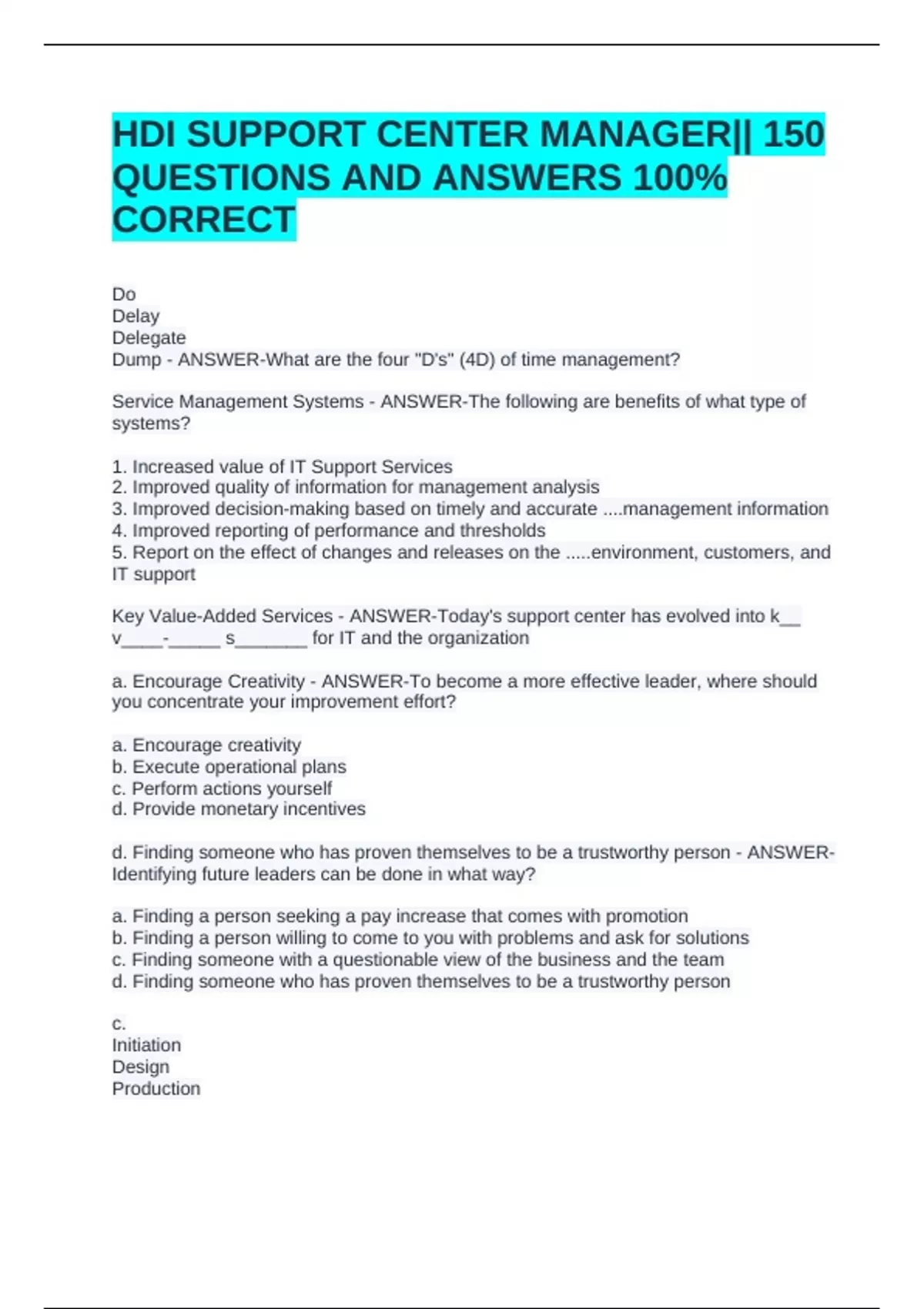 HDI SUPPORT CENTER MANAGER|| 150 QUESTIONS AND ANSWERS 100% CORRECTHDI SUPPORT CENTER MANAGER|| 150 QUESTIONS AND ANSWERS 100% CORRECTHDI SUPPORT CENTER MANAGER|| 150 QUESTIONS AND ANSWERS 100% CORRECT Do Delay Delegate Dump - ANSWER-What are the four "D's" (4D) of time management? Service Management Systems - ANSWER-The following are benefits of what type of systems? 1. Increased value of IT Support Services