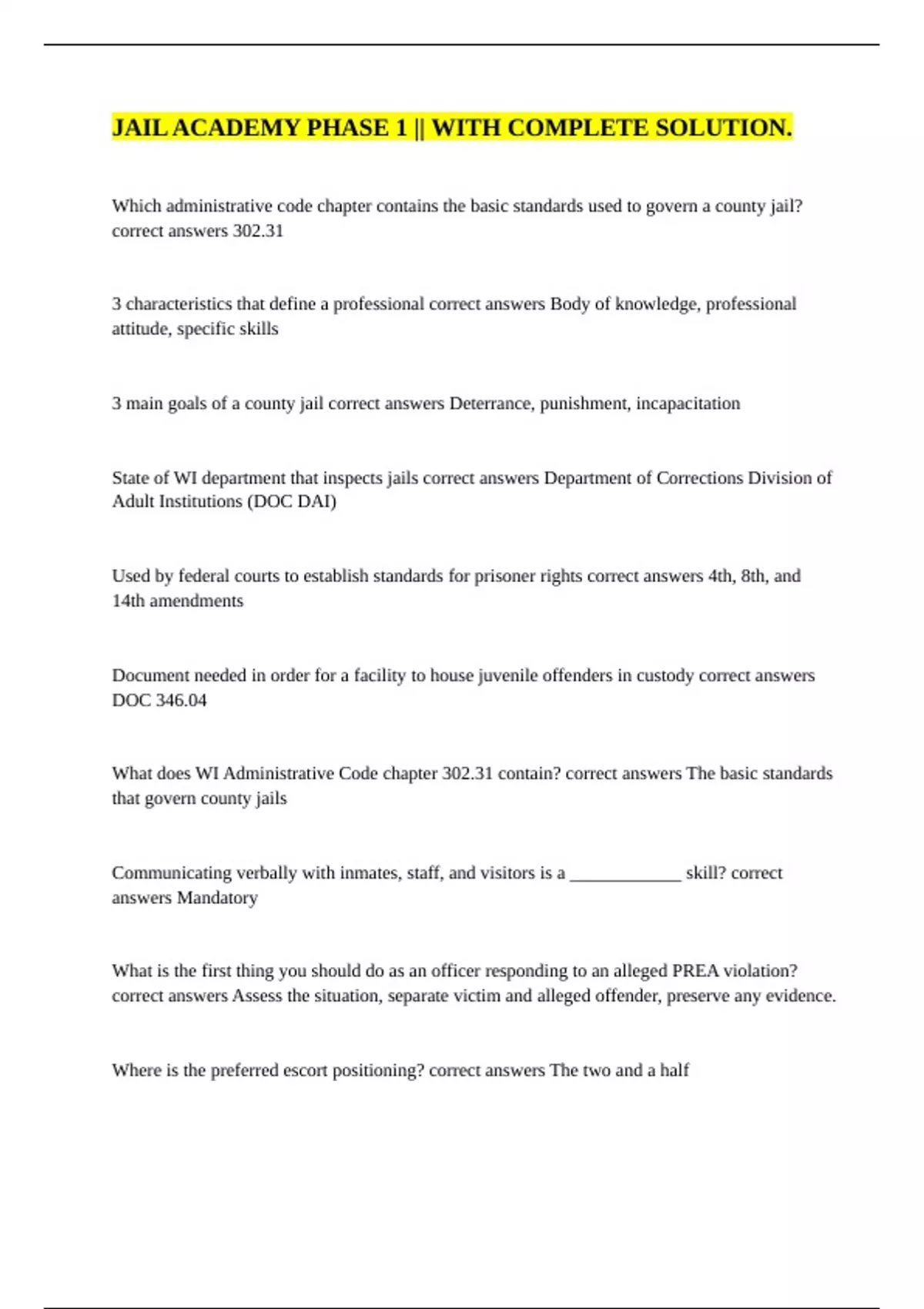 Which administrative code chapter contains the basic standards used to govern a county jail? correct answers 302.31 3 characteristics that define a professional correct answers Body of knowledge, professional attitude, specific skills 3 main goals of a county jail correct answers Deterrance, punishment, incapacitation State of WI department that inspects jails correct answers Department of Corrections Division of Adult Institutions (DOC DAI) Used by federal courts to establish standards for prisoner rights correct answers 4th, 8th, and 14th amendments Document needed in order for a facility to house juvenile offenders in custody correct answers DOC 346.04 What does WI Administrative Code chapter 302.31 contain? correct answers The basic standards that govern county jails Communicating verbally with inmates, staff, and visitors is a ____________ skill? correct answers Mandatory What is the first thing you should do as an officer responding to an alleged PREA violation? correct answers Assess the situation, separate victim and alleged offender, preserve any evidence.