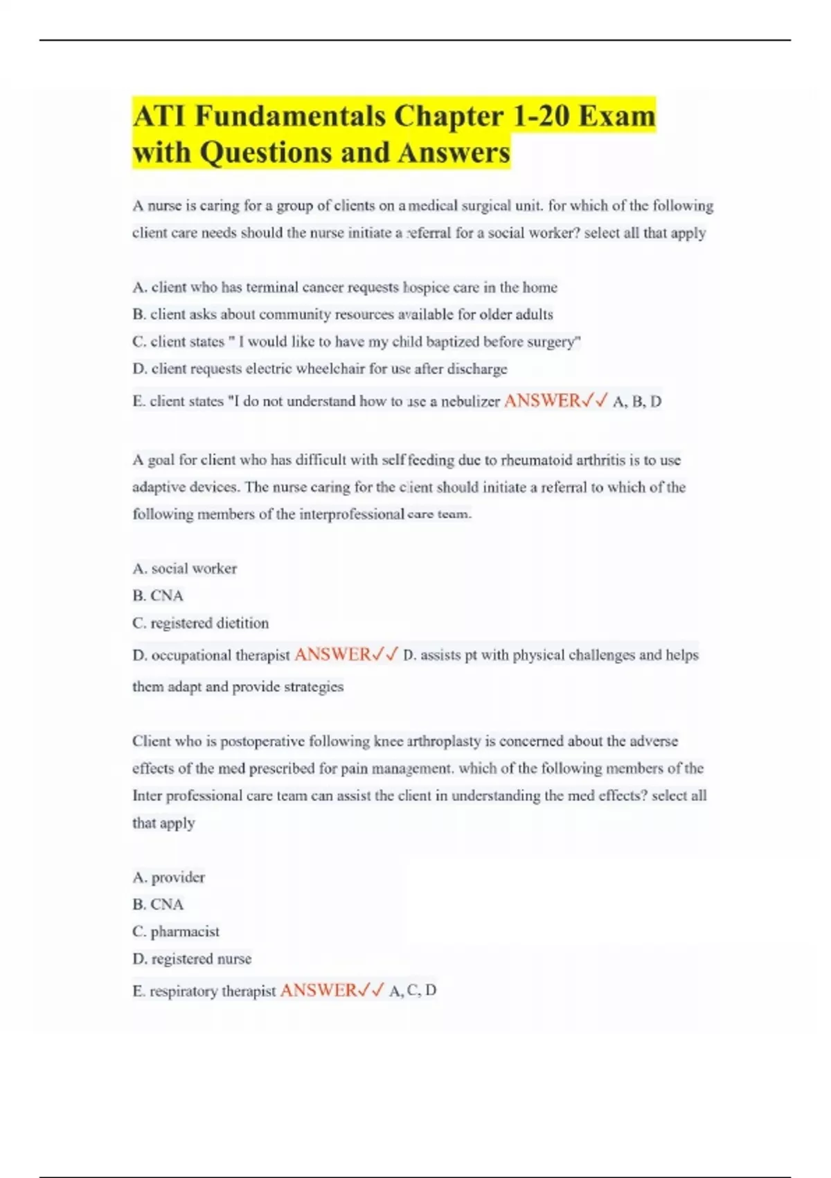 ATI Fundamentals Chapter 1-20 Exam with Questions and Answers A nurse is caring for a group of clients on a medical surgical unit. for which of the following client care needs should the nurse initiate a referral for a social worker? select all that apply A. client who has terminal cancer requests hospice care in the home B. client asks about community resources available for older adults C. client states " I would like to have my child baptized before surgery" D. client requests electric wheelchair for use after discharge E. client states "I do not understand how to use a nebulizer ANSWER A, B, D A goal for client who has difficult with self feeding due to rheumatoid arthritis is to use adaptive devices. The nurse caring for the client should initiate a referral to which of the following members of the interprofessional care team. A. social worker B. CNA C. registered dietition D. occupational therapist ANSWER D. assists pt with physical challenges and helps them adapt and provide strategies Client who is postoperative following knee arthroplasty is concerned about the adverse effects of the med prescribed for pain management. which of the following members of the Inter professional care team can assist the client in understanding the med effects? select all that apply A. provider B. CNA C. pharmacist D. registered nurse E. respiratory therapist ANSWER A, C, D