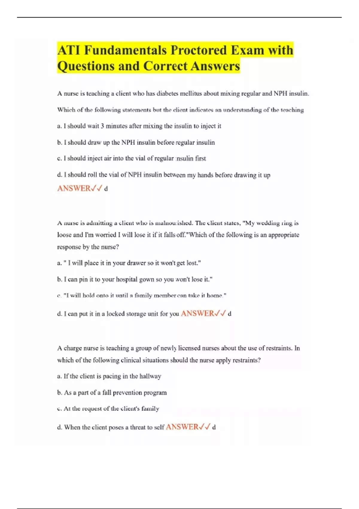 ATI Fundamentals Proctored Exam with Questions and Correct Answers A nurse is teaching a client who has diabetes mellitus about mixing regular and NPH insulin. Which of the following statements but the client indicates an understanding of the teaching a. I should wait 3 minutes after mixing the insulin to inject it b. I should draw up the NPH insulin before regular insulin c. I should inject air into the vial of regular insulin first d. I should roll the vial of NPH insulin between my hands before drawing it up ANSWER d A nurse is admitting a client who is malnourished. The client states, "My wedding ring is loose and I'm worried I will lose it if it falls off."Which of the following is an appropriate response by the nurse? a. " I will place it in your drawer so it won't get lost." b. I can pin it to your hospital gown so you won't lose it." c. "I will hold onto it until a family member can take it home." d. I can put it in a locked storage unit for you ANSWER d A charge nurse is teaching a group of newly licensed nurses about the use of restraints. In which of the following clinical situations should the nurse apply restraints? a. If the client is pacing in the hallway b. As a part of a fall prevention program c. At the request of the client's family d. When the client poses a threat to self ANSWER d