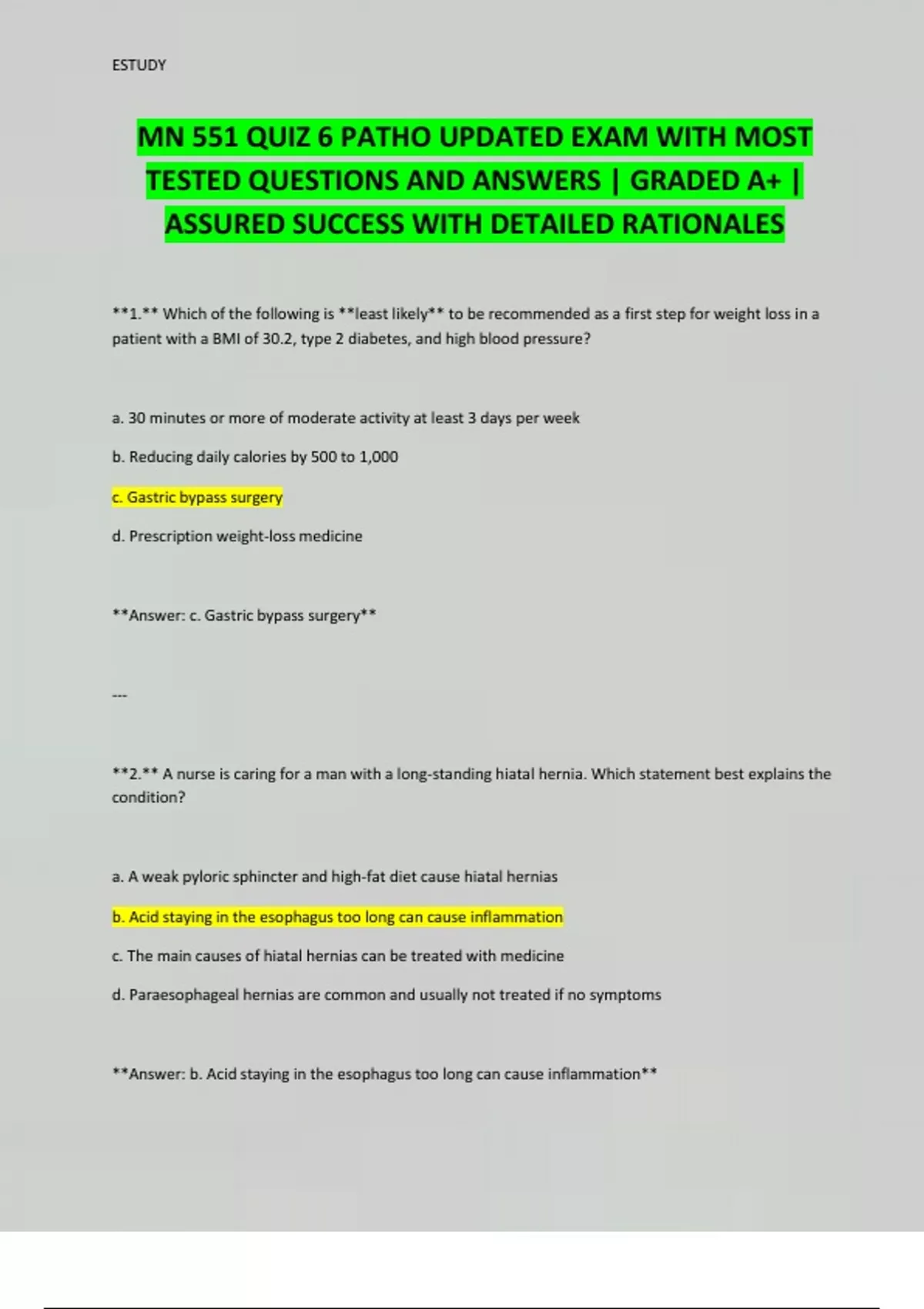 MN 551 QUIZ 6 PATHO UPDATED EXAM WITH MOST