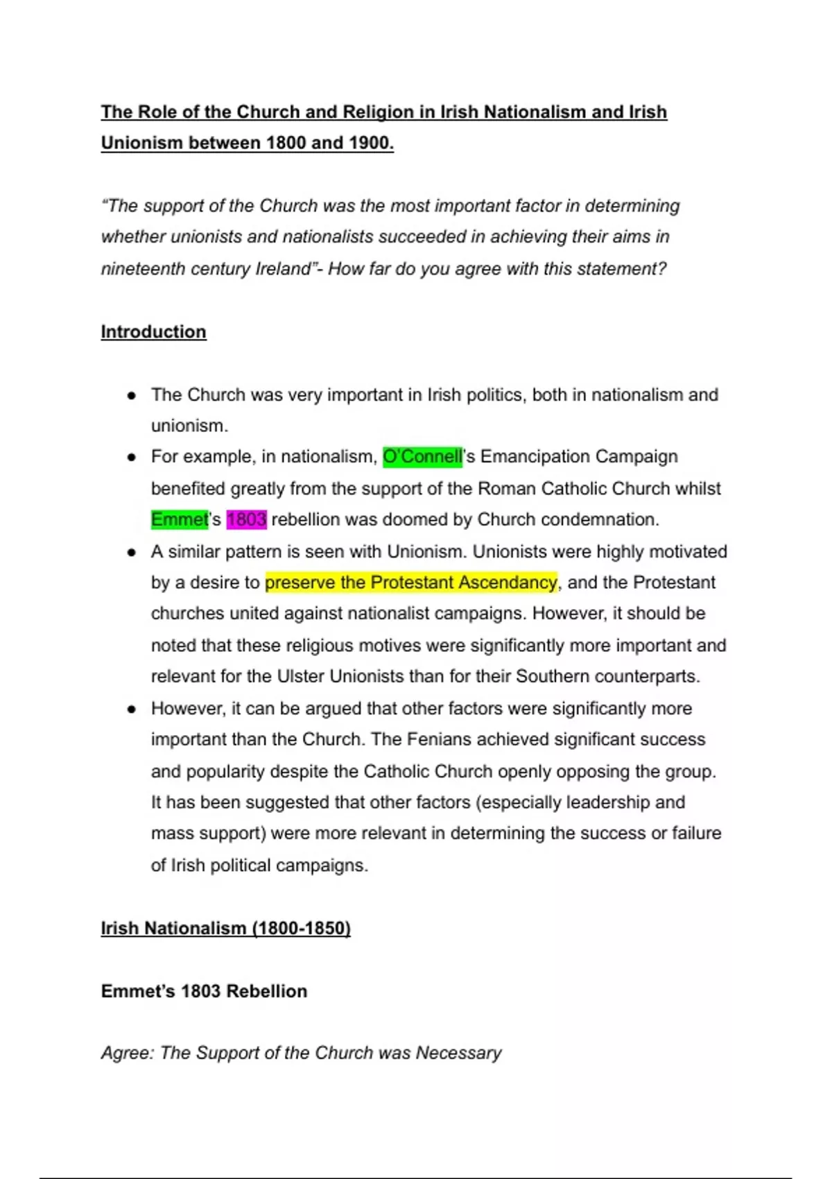 "Church support was the most important factor in Irish Nationalist and Irish Unionist success between 1800 and 1900". This essay received full marks (40/40) in the "Ireland Under the Union ()" segment of A Level History. I have included an in-depth, colour-coded essay plan as well as an annotated version of the full essay. Happy studying!