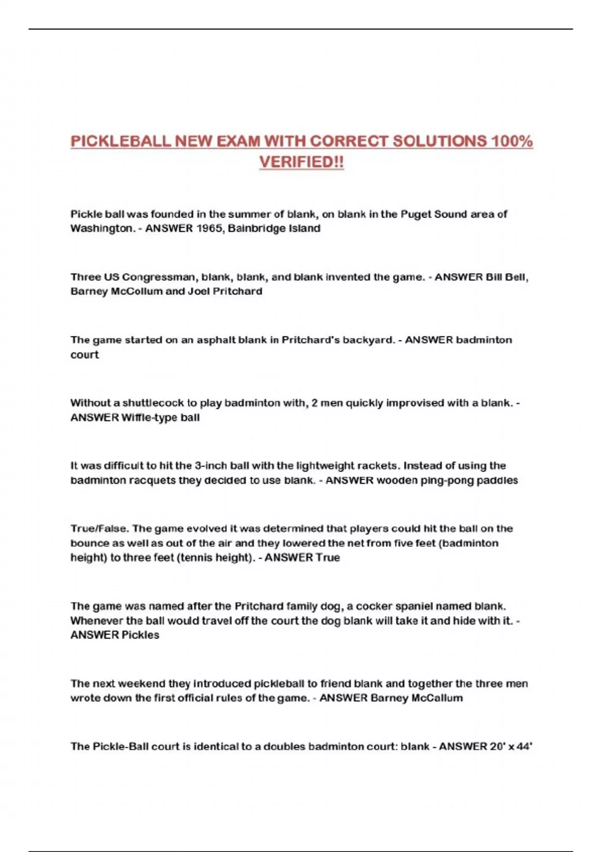 PICKLEBALL NEW EXAM WITH CORRECT SOLUTIONS 100% VERIFIED!!...