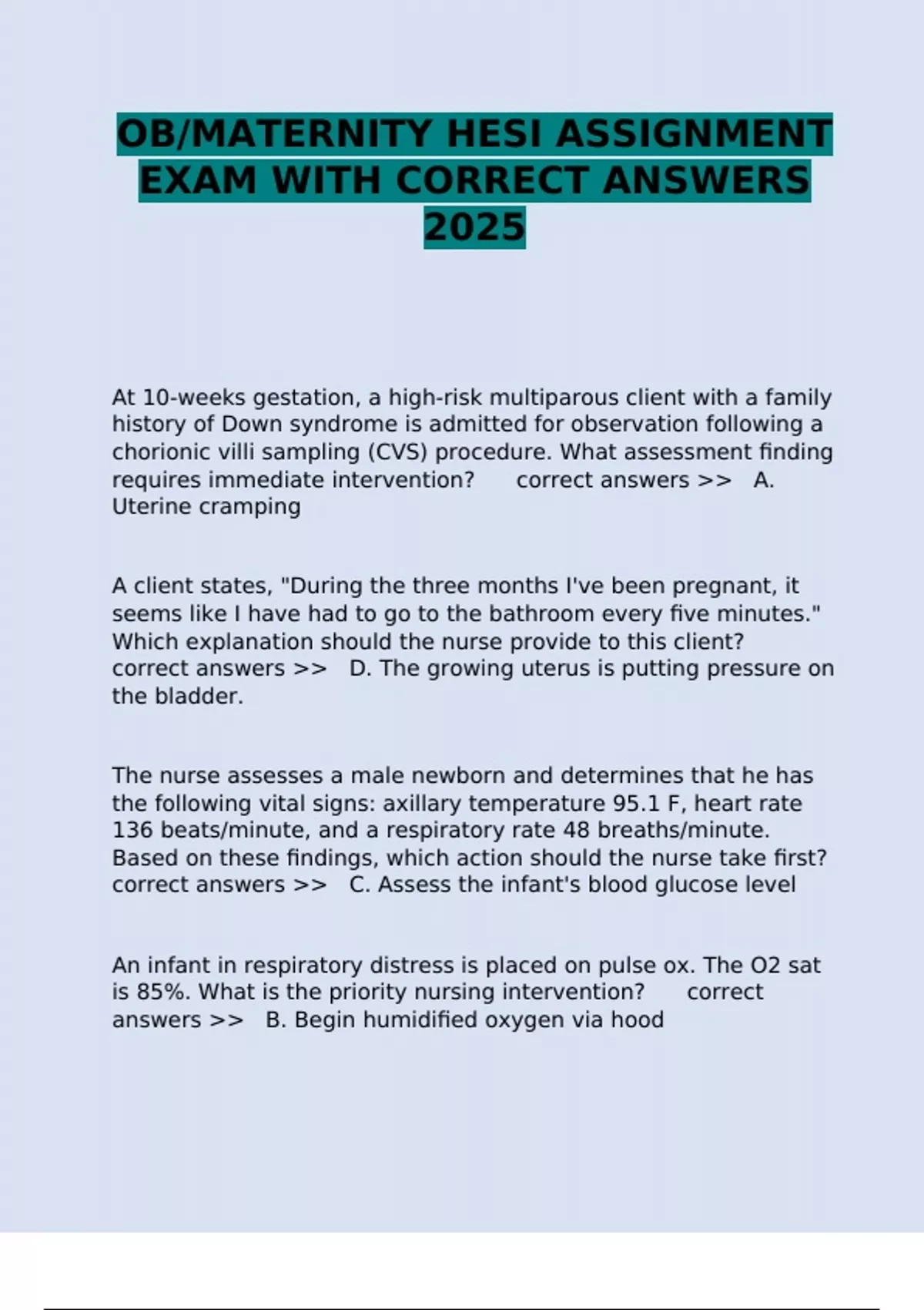 OB/MATERNITY HESI ASSIGNMENT EXAM WITH CORRECT ANSWERS 2025