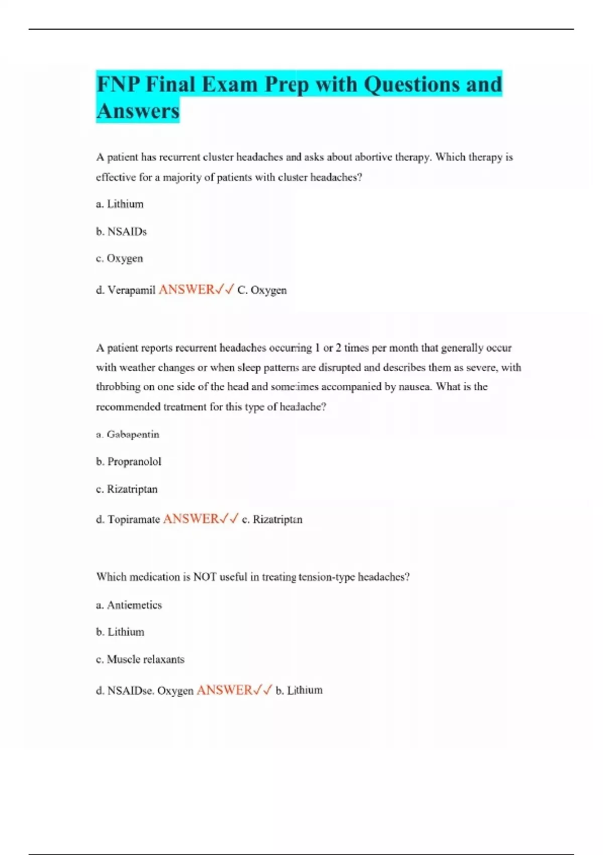 FNP Final Exam Prep with Questions and Answers A patient has recurrent cluster headaches and asks about abortive therapy. Which therapy is effective for a majority of patients with cluster headaches? a. Lithium b. NSAIDs c. Oxygen d. Verapamil ANSWER C. Oxygen A patient reports recurrent headaches occurring 1 or 2 times per month that generally occur with weather changes or when sleep patterns are disrupted and describes them as severe, with throbbing on one side of the head and sometimes accompanied by nausea. What is the recommended treatment for this type of headache? a. Gabapentin b. Propranolol c. Rizatriptan d. Topiramate ANSWER c. Rizatriptan Which medication is NOT useful in treating tension-type headaches? a. Antiemetics b. Lithium c. Muscle relaxants d. NSAIDse. Oxygen ANSWER b. Lithium