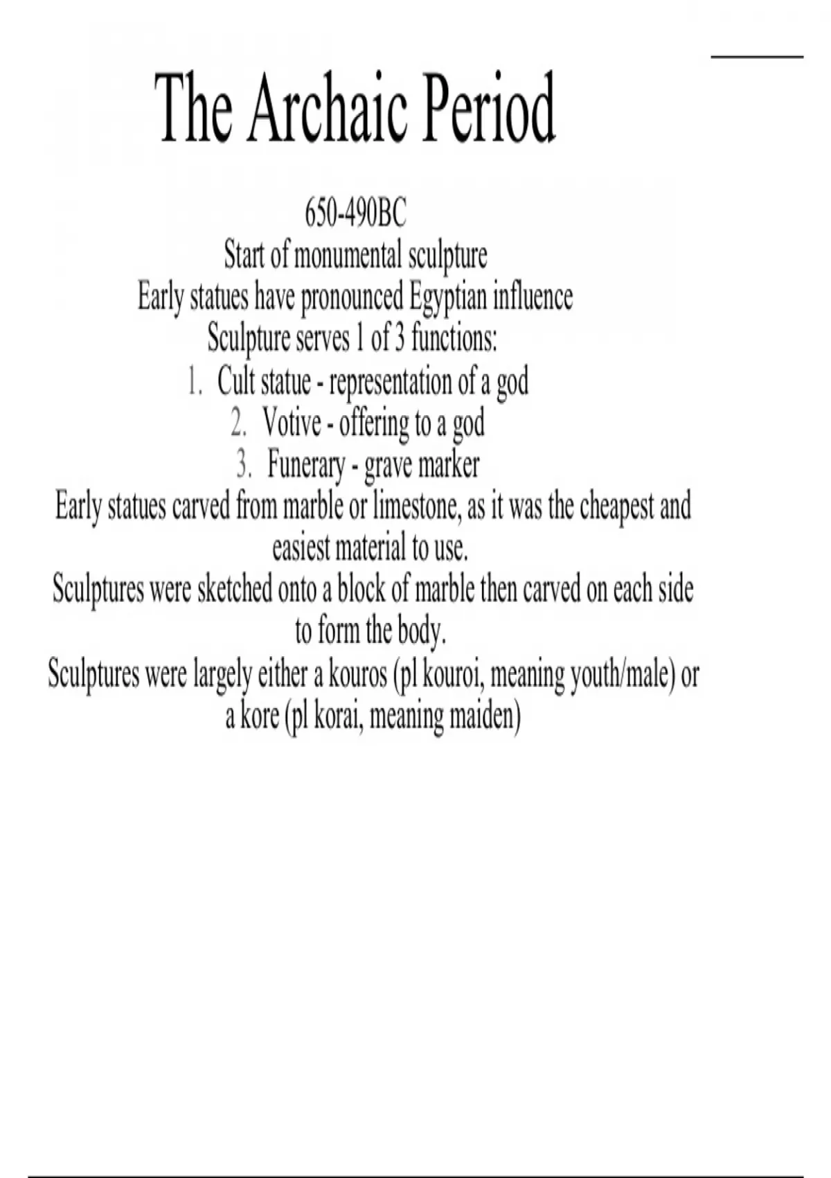 Sculptures were largely either a kouros (pl kouroi, meaning youth/male) or