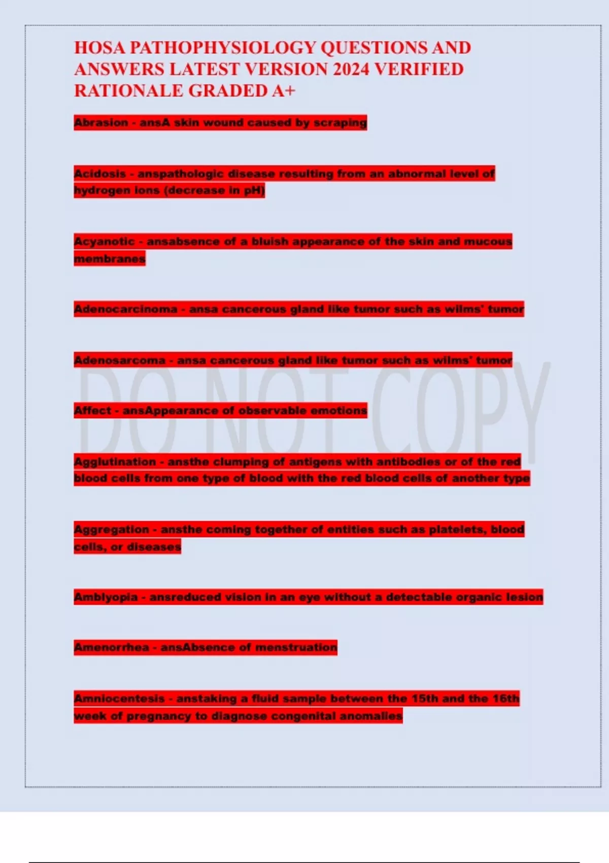 HOSA PATHOPHYSIOLOGY QUESTIONS AND ANSWERS LATEST VERSION 2024 VERIFIED