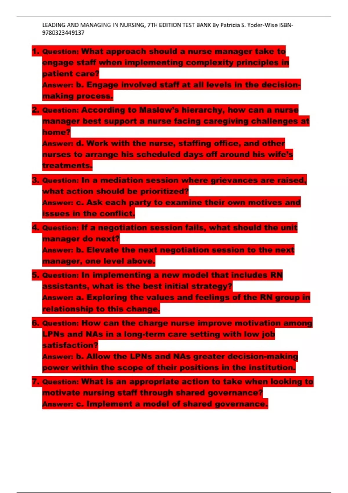 , LEADING AND MANAGING IN NURSING, 7TH EDITION TEST BANK By Patricia S. Yoder-Wise ISBN-
