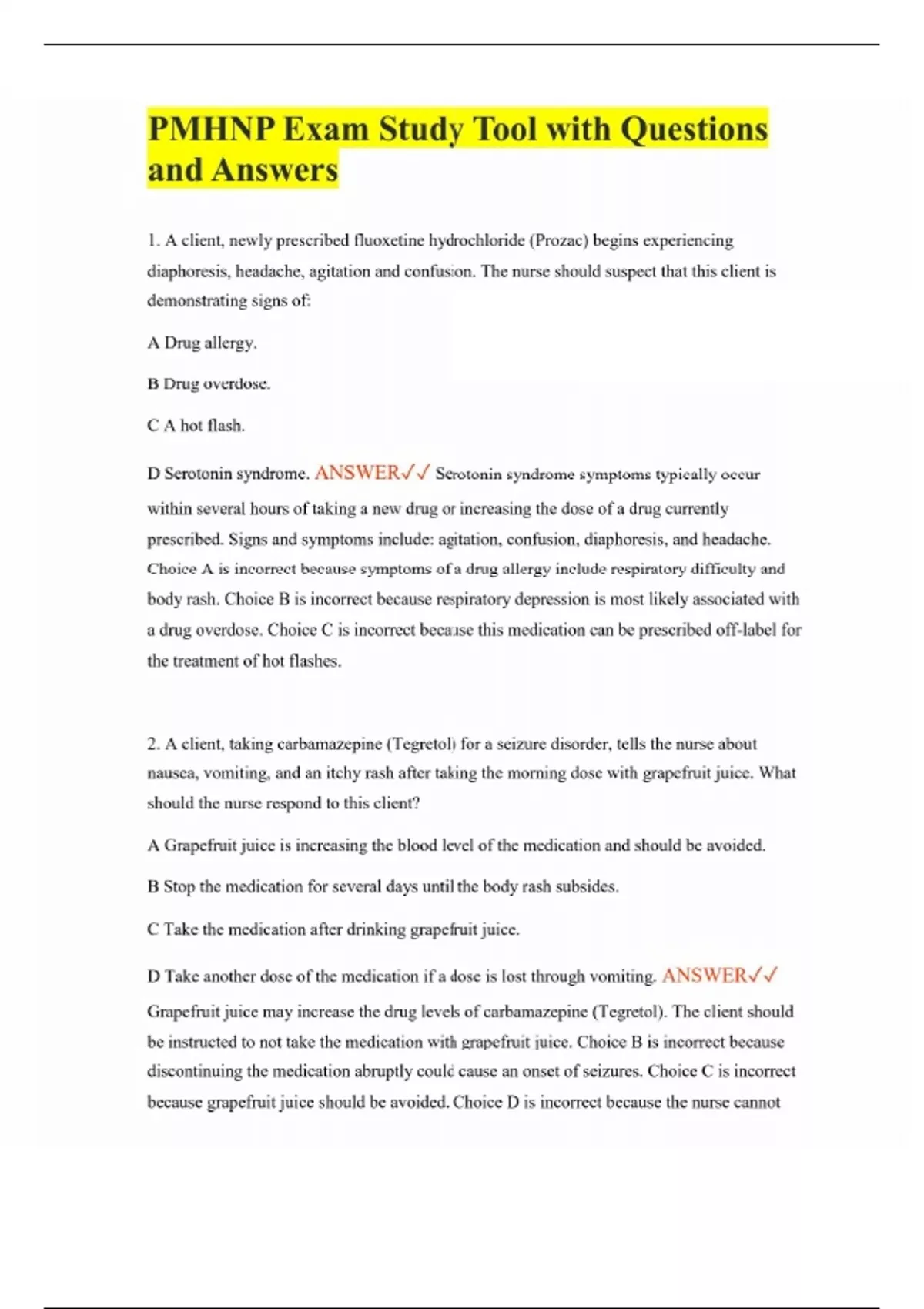 PMHNP Exam Study Tool with Questions and Answers 1. A client, newly prescribed fluoxetine hydrochloride (Prozac) begins experiencing diaphoresis, headache, agitation and confusion. The nurse should suspect that this client is demonstrating signs of: A Drug allergy. B Drug overdose. C A hot flash. D Serotonin syndrome. ANSWER Serotonin syndrome symptoms typically occur within several hours of taking a new drug or increasing the dose of a drug currently prescribed. Signs and symptoms include: agitation, confusion, diaphoresis, and headache. Choice A is incorrect because symptoms of a drug allergy include respiratory difficulty and body rash. Choice B is incorrect because respiratory depression is most likely associated with a drug overdose. Choice C is incorrect because this medication can be prescribed off-label for the treatment of hot flashes. 2. A client, taking carbamazepine (Tegretol) for a seizure disorder, tells the nurse about nausea, vomiting, and an itchy rash after taking the morning dose with grapefruit juice. What should the nurse respond to this client? A Grapefruit juice is increasing the blood level of the medication and should be avoided. B Stop the medication for several days until the body rash subsides. C Take the medication after drinking grapefruit juice. D Take another dose of the medication if a dose is lost through vomiting. ANSWER Grapefruit juice may increase the drug levels of carbamazepine (Tegretol). The client should be instructed to not take the medication with grapefruit juice. Choice B is incorrect because discontinuing the medication abruptly could cause an onset of seizures. Choice C is incorrect because grapefruit juice should be avoided. Choice D is incorrect because the nurse cannot