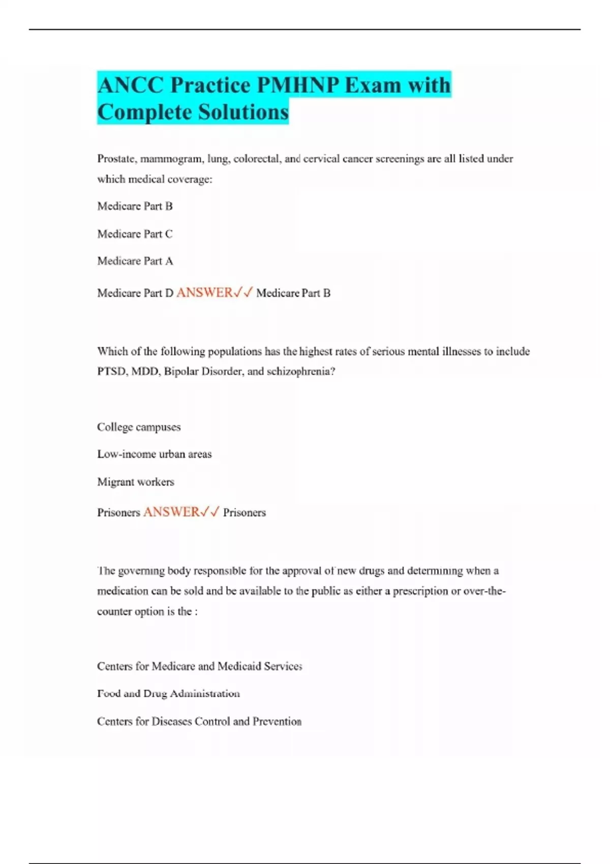 ANCC Practice PMHNP Exam with Complete Solutions Prostate, mammogram, lung, colorectal, and cervical cancer screenings are all listed under which medical coverage: Medicare Part B Medicare Part C Medicare Part A Medicare Part D ANSWER Medicare Part B Which of the following populations has the highest rates of serious mental illnesses to include PTSD, MDD, Bipolar Disorder, and schizophrenia? College campuses Low-income urban areas Migrant workers Prisoners ANSWER Prisoners The governing body responsible for the approval of new drugs and determining when a medication can be sold and be available to the public as either a prescription or over-the-counter option is the : Centers for Medicare and Medicaid Services Food and Drug Administration Centers for Diseases Control and Prevention