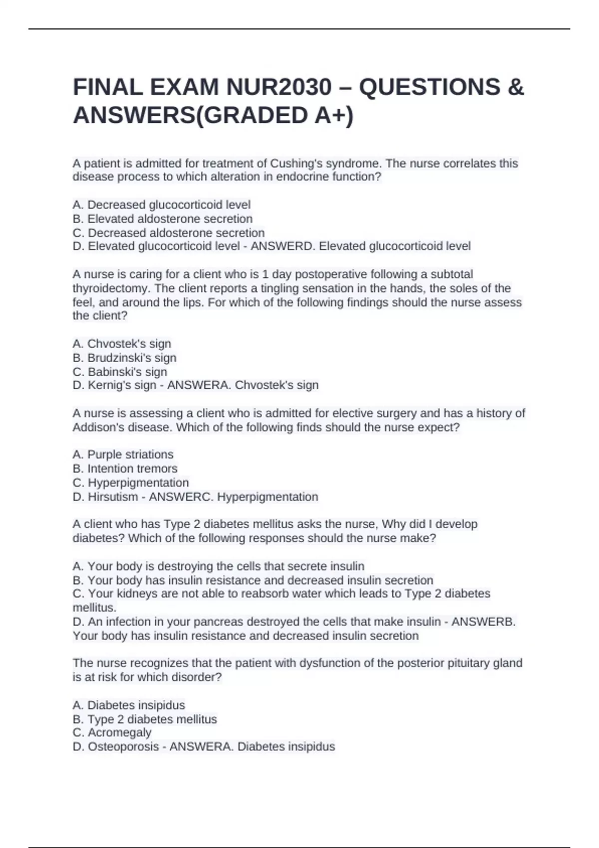 A patient is admitted for treatment of Cushing's syndrome. The nurse correlates this disease process to which alteration in endocrine function? A. Decreased glucocorticoid level B. Elevated aldosterone secretion C. Decreased aldosterone secretion D. Elevated glucocorticoid level - ANSWERD. Elevated glucocorticoid level A nurse is caring for a client who is 1 day postoperative following a subtotal thyroidectomy. The client reports a tingling sensation in the hands, the soles of the feel, and around the lips. For which of the following findings should the nurse assess the client? A. Chvostek's sign B. Brudzinski's sign C. Babinski's sign D. Kernig's sign - ANSWERA. Chvostek's sign A nurse is assessing a client who is admitted for elective surgery and has a history of Addison's disease. Which of the following finds should the nurse expect? A. Purple striations B. Intention tremors C. Hyperpigmentation D. Hirsutism - ANSWERC. Hyperpigmentation A client who has Type 2 diabetes mellitus asks the nurse, Why did I develop diabetes? Which of the following responses should the nurse make? A. Your body is destroying the cells that secrete insulin B. Your body has insulin resistance and decreased insulin secretion C. Your kidneys are not able to reabsorb water which leads to Type 2 diabetes mellitus. D. An infection in your pancreas destroyed the cells that make insulin - ANSWERB. Your body has insulin resistance and decreased insulin secretion The nurse recognizes that the patient with dysfunction of the posterior pituitary gland is at risk for which disorder? A. Diabetes insipidus B. Type 2 diabetes mellitus C. Acromegaly D. Osteoporosis - ANSWERA. Diabetes insipidus A nurse is teaching a client who has type 1 diabetes mellitus about exercise. Which of the following instructions should the nurse include? A. Examine your feet weekly B. Do not exercise if ketones are present in your urine C. Perform vigorous exercise when blood glucose is less than 100 mg D. Avoid eating for 2 hours before exercise - ANSWERB. Do not exercise if ketones are present in your urine. A client with syndrome of inappropriate antidiuretic hormone (SIADH) is experiencing a headache and confusion. The nurse correlates which laboratory result to this clinical presentation of SIADH? A. Calcium 8.7 mEq/L (Range: 8.5 - 10.2 mEq/L) B. Sodium 125 mEq/L (Range: 135-145 mEq/L) C. Hematocrit 40% (Range: 37-52%) D. Potassium 5.5 mEq/L (Range: 3.5 - 5.2 mEq/L) - ANSWERB. Sodium 125 mEq/L (Range: 135-145 mEq/L) A nurse is teaching a client who is taking metformin XR (Glucophage ER) for type II diabetes mellitus. Which of the following instructions should the nurse include in the teaching? A. This medication may turn your urine orange. B. You may crush or chew the medication. C. Take the medication with a meal D. This medication may cause an increase in perspiration - ANSWERC. Take the medication with a meal A client is brought to the emergency department in an unresponsive state, and a diagnosis of hyperosmolar hyperglycemic syndrome is made. The nurse would immediately prepare to initiate which provider prescription? A. Cooling blanket B. Intravenous infusion of normal saline C. Intravenous infusion of sodium bicarbonate D. 100 units of NPH insulin - ANSWERB. Intravenous infusion of normal saline A nurse is assessing a client who has diabetes Insipidus. Which of the following findings should the nurse expect? A. Hyperglycemia B. Dehydration C. Polyphagia D. Bradycardia - ANSWERB. Dehydration A nurse is assessing a client who has diabetes mellitus. Which of the following findings is a manifestation of hypoglycemia? A. Fruity odor on the client's breath B. Cool, clammy skin