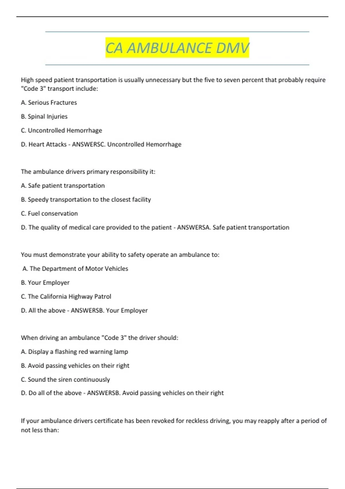 Exam of 11 pages for the course CA AMBULANCE at CA AMBULANCE (CA AMBULANCE DMV)