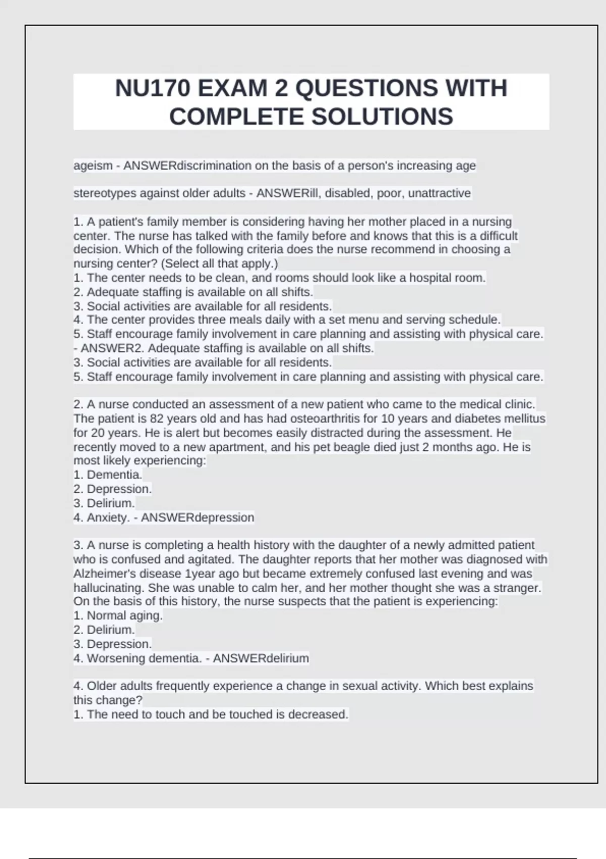 ageism - ANSWERdiscrimination on the basis of a person's increasing age stereotypes against older adults - ANSWERill, disabled, poor, unattractive 1. A patient's family member is considering having her mother placed in a nursing center. The nurse has talked with the family before and knows that this is a difficult decision. Which of the following criteria does the nurse recommend in choosing a nursing center? (Select all that apply.) 1. The center needs to be clean, and rooms should look like a hospital room. 2. Adequate staffing is available on all shifts. 3. Social activities are available for all residents. 4. The center provides three meals daily with a set menu and serving schedule. 5. Staff encourage family involvement in care planning and assisting with physical care. - ANSWER2. Adequate staffing is available on all shifts. 3. Social activities are available for all residents. 5. Staff encourage family involvement in care planning and assisting with physical care. 2. A nurse conducted an assessment of a new patient who came to the medical clinic. The patient is 82 years old and has had osteoarthritis for 10 years and diabetes mellitus for 20 years. He is alert but becomes easily distracted during the assessment. He recently moved to a new apartment, and his pet beagle died just 2 months ago. He is most likely experiencing: 1. Dementia. 2. Depression. 3. Delirium.