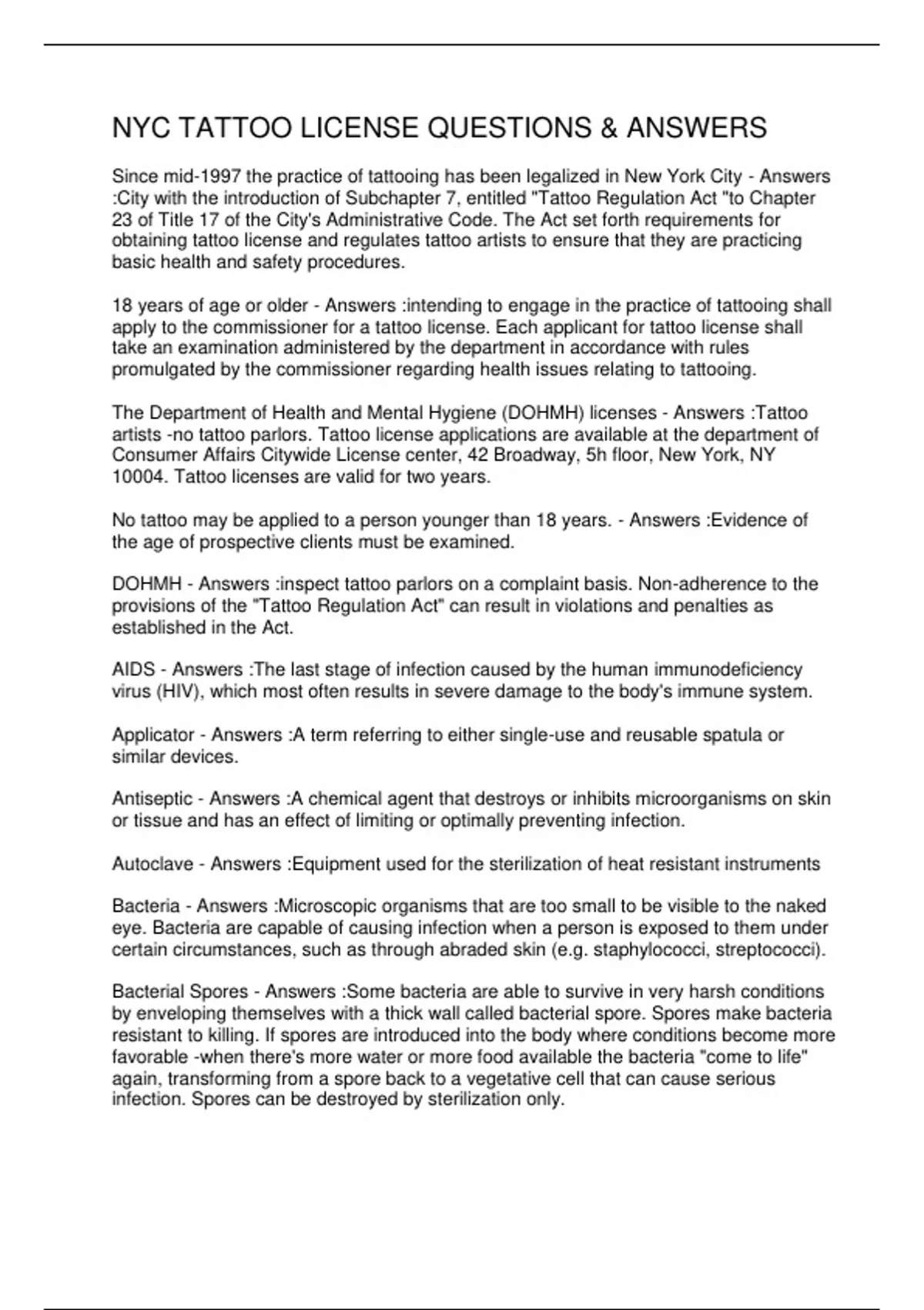 NYC TATTOO LICENSE QUESTIONS & ANSWERS