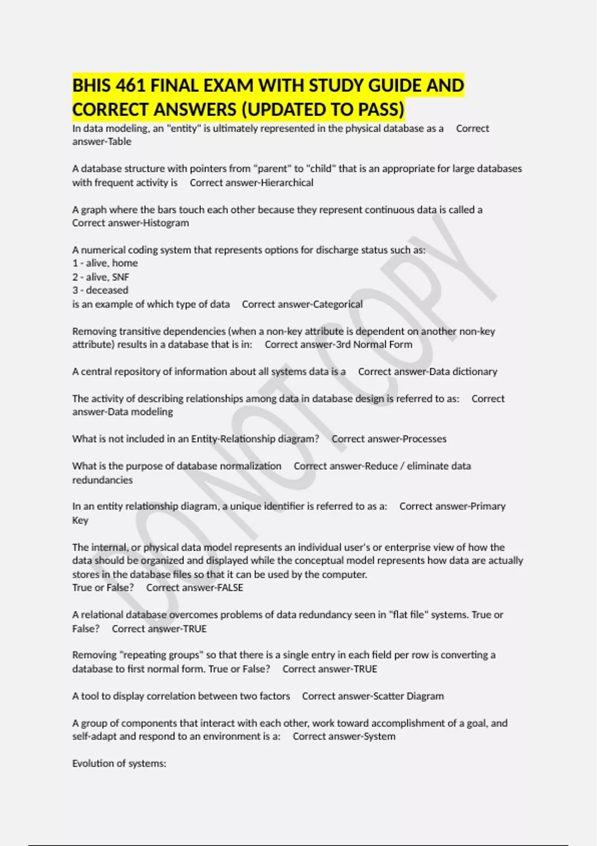 BHIS 461 FINAL EXAM WITH STUDY GUIDE AND