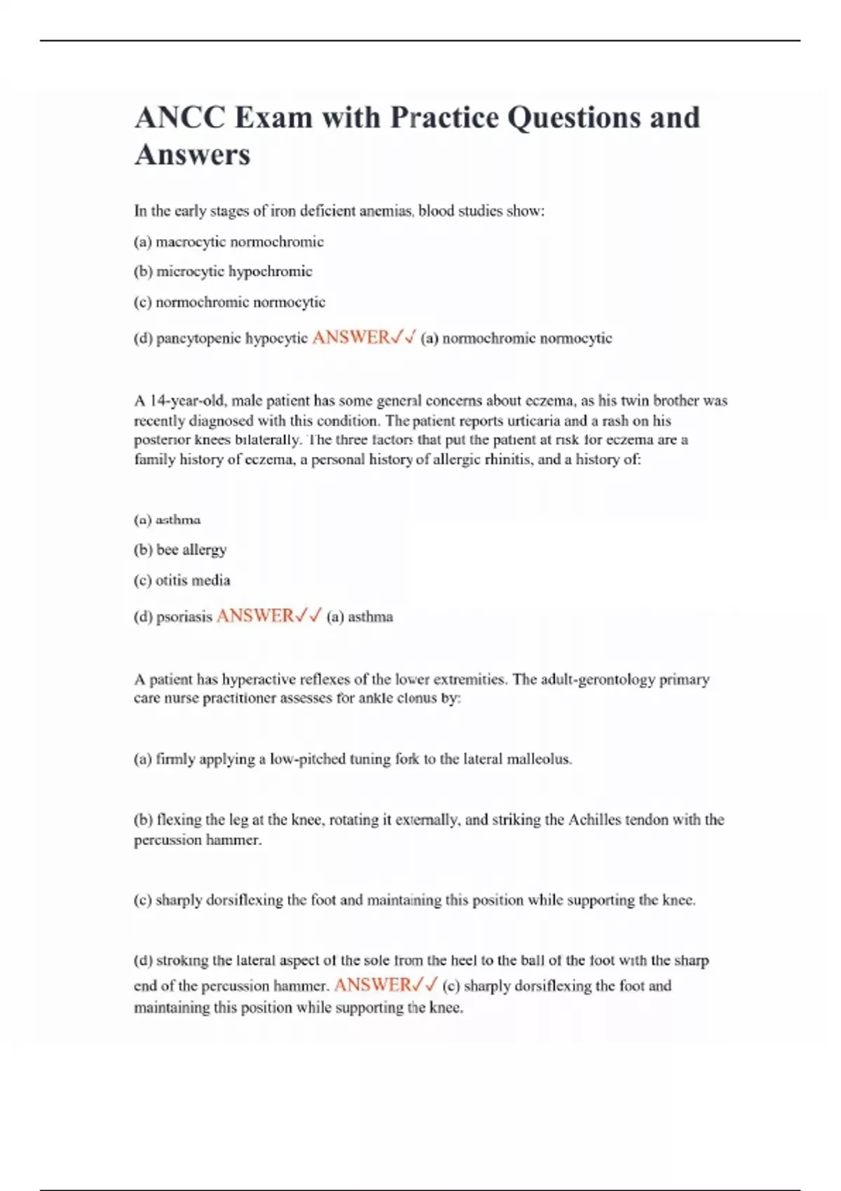 ANCC Exam with Practice Questions and Answers In the early stages of iron deficient anemias, blood studies show: (a) macrocytic normochromic (b) microcytic hypochromic (c) normochromic normocytic (d) pancytopenic hypocytic ANSWER (a) normochromic normocytic A 14-year-old, male patient has some general concerns about eczema, as his twin brother was recently diagnosed with this condition. The patient reports urticaria and a rash on his posterior knees bilaterally. The three factors that put the patient at risk for eczema are a family history of eczema, a personal history of allergic rhinitis, and a history of: (a) asthma (b) bee allergy (c) otitis media (d) psoriasis ANSWER (a) asthma A patient has hyperactive reflexes of the lower extremities. The adult-gerontology primary care nurse practitioner assesses for ankle clonus by: (a) firmly applying a low-pitched tuning fork to the lateral malleolus. (b) flexing the leg at the knee, rotating it externally, and striking the Achilles tendon with the percussion hammer. (c) sharply dorsiflexing the foot and maintaining this position while supporting the knee. (d) stroking the lateral aspect of the sole from the heel to the ball of the foot with the sharp end of the percussion hammer. ANSWER (c) sharply dorsiflexing the foot and maintaining this position while supporting the knee.