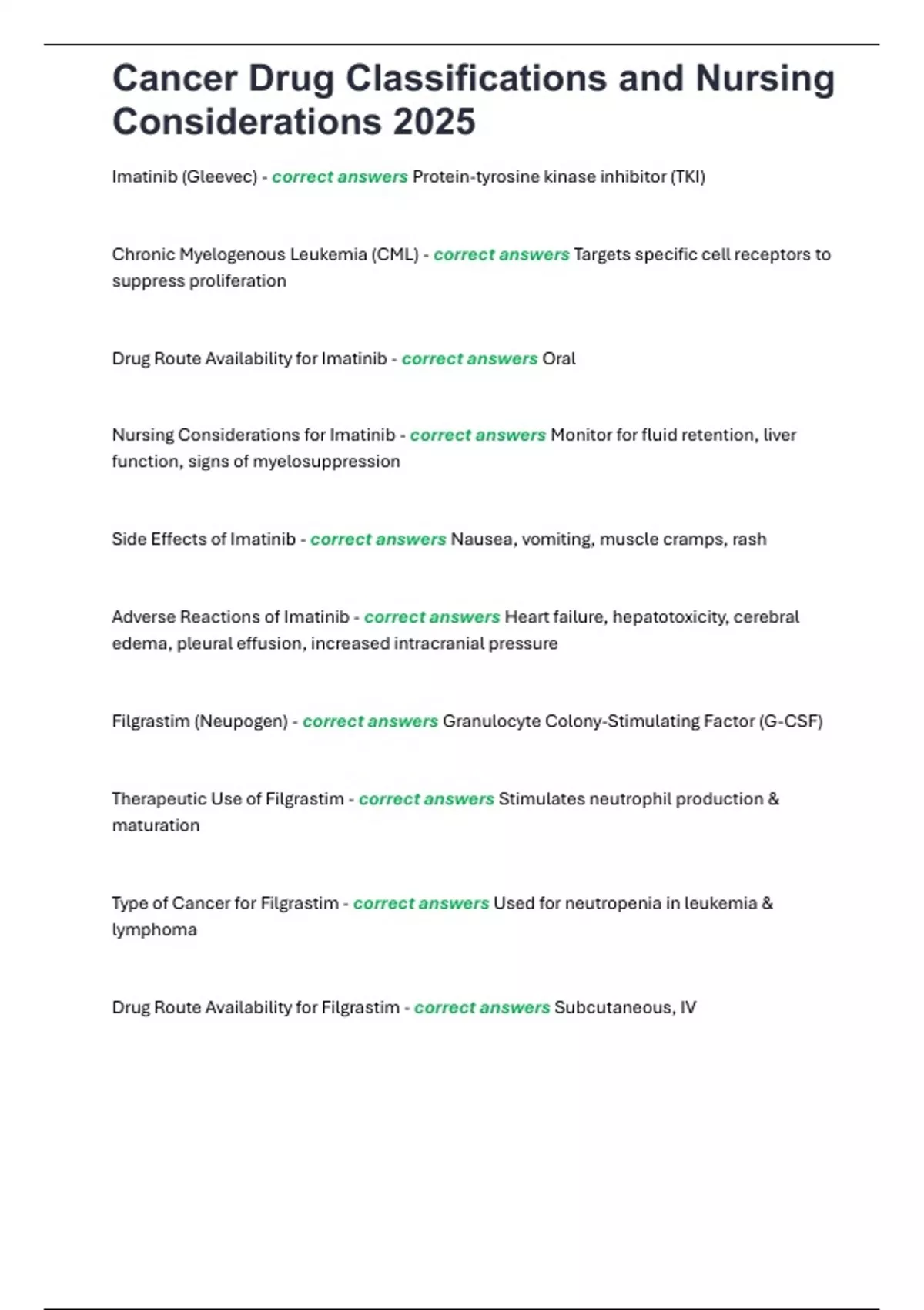 Nursing Considerations for Imatinib - correct answers Monitor for fluid retention, liver