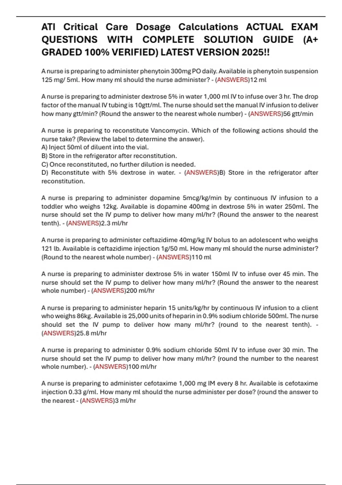 ATI Critical Care Dosage Calculations ACTUAL EXAM QUESTIONS WITH COMPLETE SOLUTION GUIDE (A+ GRADED 100% VERIFIED) LATEST VERSION 2025!!
