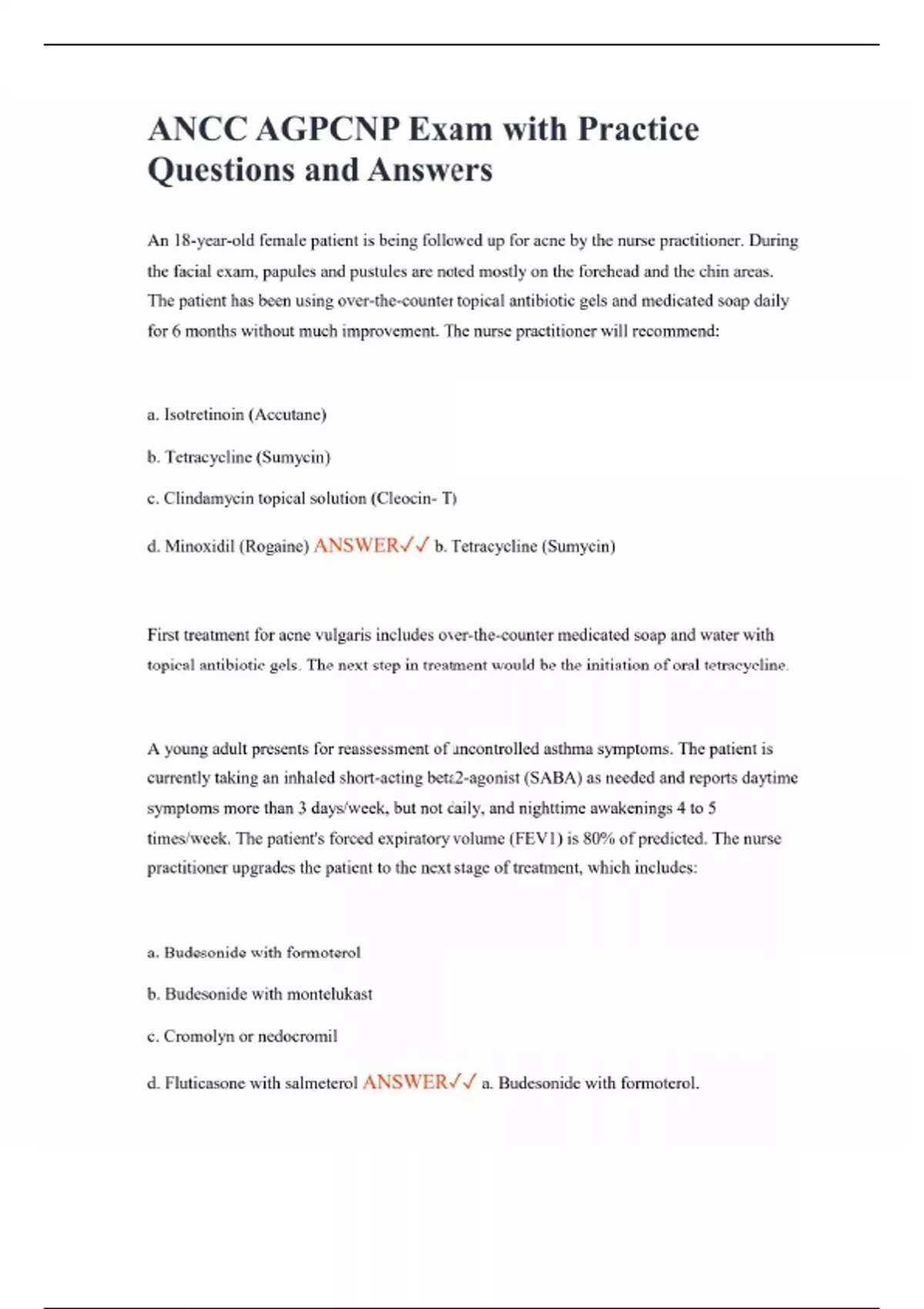 ANCC AGPCNP Exam with Practice Questions and Answers An 18-year-old female patient is being followed up for acne by the nurse practitioner. During the facial exam, papules and pustules are noted mostly on the forehead and the chin areas. The patient has been using over-the-counter topical antibiotic gels and medicated soap daily for 6 months without much improvement. The nurse practitioner will recommend: a. Isotretinoin (Accutane) b. Tetracycline (Sumycin) c. Clindamycin topical solution (Cleocin- T) d. Minoxidil (Rogaine) ANSWER b. Tetracycline (Sumycin) First treatment for acne vulgaris includes over-the-counter medicated soap and water with topical antibiotic gels. The next step in treatment would be the initiation of oral tetracycline. A young adult presents for reassessment of uncontrolled asthma symptoms. The patient is currently taking an inhaled short-acting beta2-agonist (SABA) as needed and reports daytime symptoms more than 3 days/week, but not daily, and nighttime awakenings 4 to 5 times/week. The patient's forced expiratory volume (FEV1) is 80% of predicted. The nurse practitioner upgrades the patient to the next stage of treatment, which includes: a. Budesonide with formoterol b. Budesonide with montelukast c. Cromolyn or nedocromil d. Fluticasone with salmeterol ANSWER a. Budesonide with formoterol.