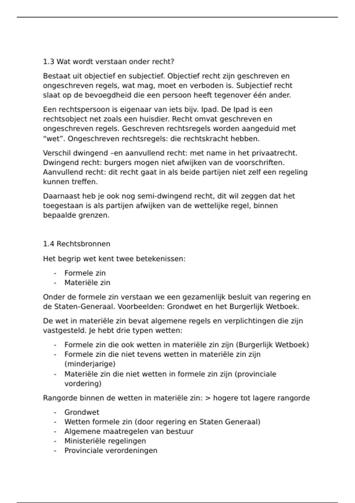 Hierbij aangeboden, supergoede en duidelijke samenvatting van het basisboek recht 9789001079635 geschreven door O.A.P. van der Roest. Betreft de 18e druk. Dit komt in het document naar voren: HS. 1.3 (Wat wordt verstaan onder recht?) HS. 1.4 (Rechtsbronnen)  HS. 2.2.1 (Begrip Rechtshandeling) HS. 2.2.4 (Ongeldigheid van rechtshandelingen) HS. 2.2.5 (Gronden voor ongeldigheid van rechtshandelingen) HS. 3.3 (Overeenkomst: onderscheidingen)  HS 3.6, 3.7 (tot ‘Niet voor risico debiteur’, p. 124) en HS 3.8.1 t/m 3.8.3 HS 4.1 en 4.1.1 en HS 4.2 en 4.2.1 HS 5.1.1 t/m p. 195HS 5.1.3 t/m 5.5.2 HS 6.2  HS 6.3.1., 6.3.2., 6.3.3. en 6.3.5 HS 7.2.1, 7.2.2, 7.2.3 en 7.5  HS 7.6 tot 7.6.4 en 7.6.6.