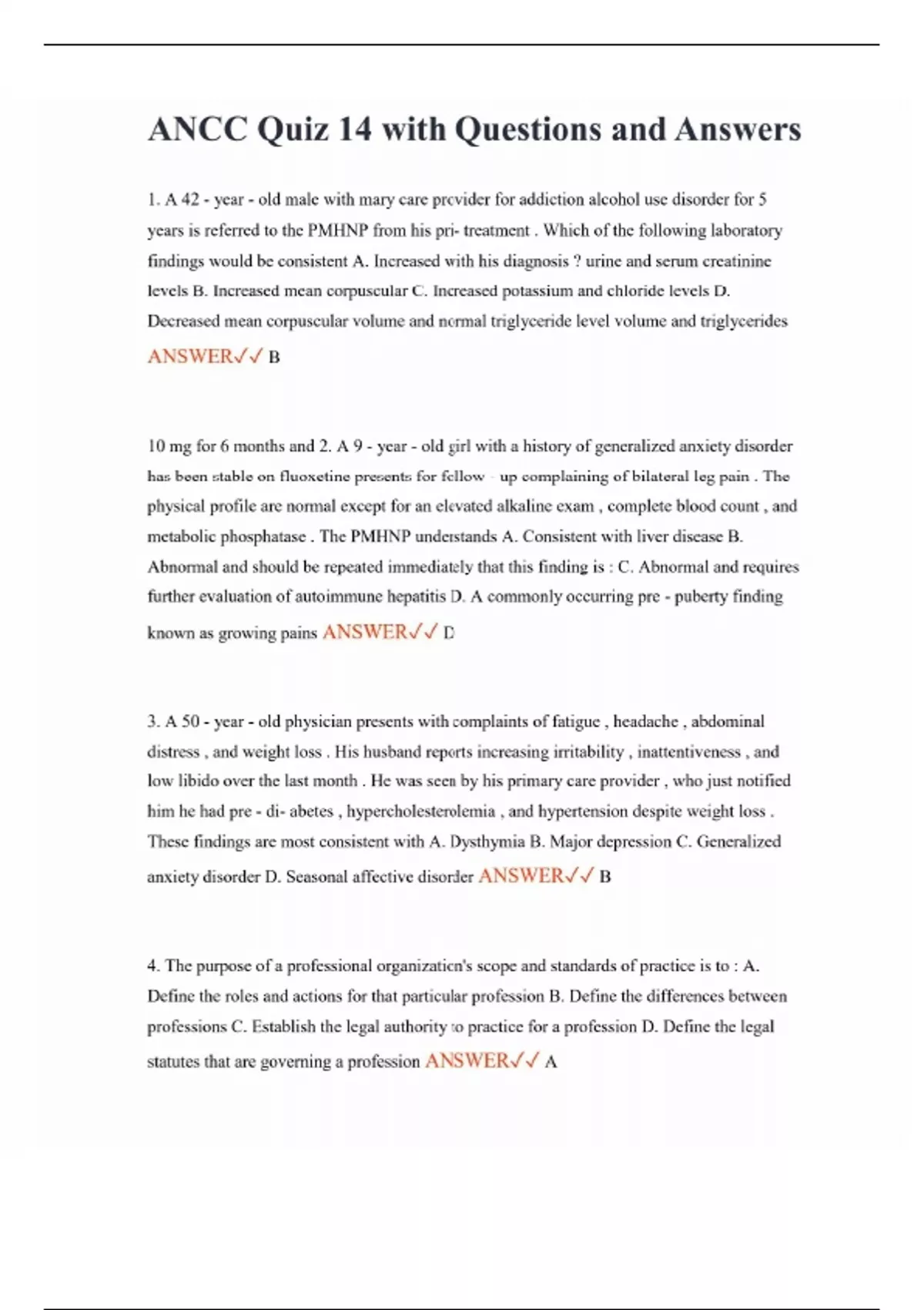 ANCC Quiz 14 with Questions and Answers 1. A 42 - year - old male with mary care provider for addiction alcohol use disorder for 5 years is referred to the PMHNP from his pri- treatment . Which of the following laboratory findings would be consistent A. Increased with his diagnosis ? urine and serum creatinine levels B. Increased mean corpuscular C. Increased potassium and chloride levels D. Decreased mean corpuscular volume and normal triglyceride level volume and triglycerides ANSWER B 10 mg for 6 months and 2. A 9 - year - old girl with a history of generalized anxiety disorder has been stable on fluoxetine presents for follow - up complaining of bilateral leg pain . The physical profile are normal except for an elevated alkaline exam , complete blood count , and metabolic phosphatase . The PMHNP understands A. Consistent with liver disease B. Abnormal and should be repeated immediately that this finding is : C. Abnormal and requires further evaluation of autoimmune hepatitis D. A commonly occurring pre - puberty finding known as growing pains ANSWER D 3. A 50 - year - old physician presents with complaints of fatigue , headache , abdominal distress , and weight loss . His husband reports increasing irritability , inattentiveness , and low libido over the last month . He was seen by his primary care provider , who just notified him he had pre - di- abetes , hypercholesterolemia , and hypertension despite weight loss . These findings are most consistent with A. Dysthymia B. Major depression C. Generalized anxiety disorder D. Seasonal affective disorder ANSWER B 4. The purpose of a professional organization's scope and standards of practice is to : A. Define the roles and actions for that particular profession B. Define the differences between professions C. Establish the legal authority to practice for a profession D. Define the legal statutes that are governing a profession ANSWER A