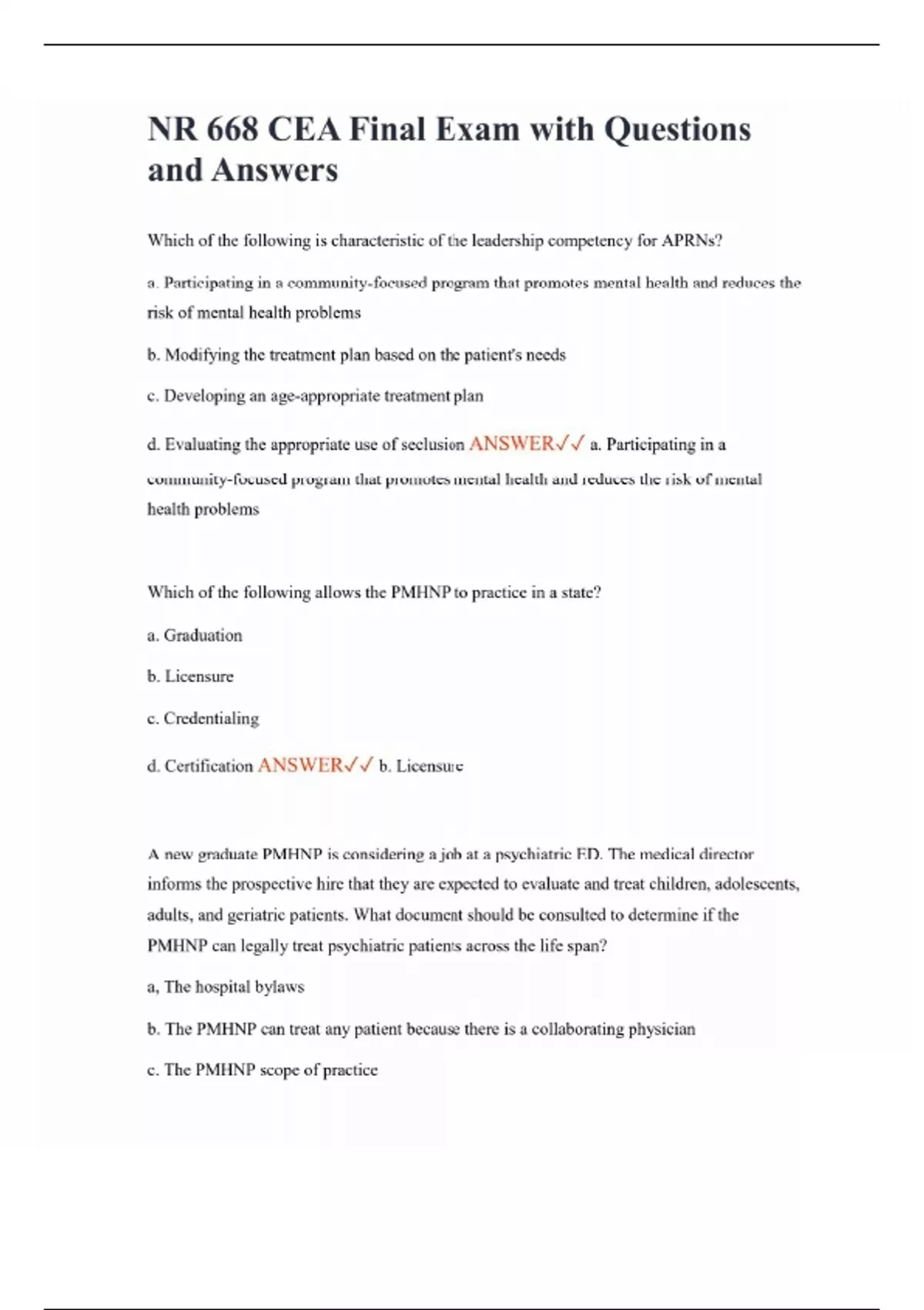 NR 668 CEA Final Exam with Questions and Answers Which of the following is characteristic of the leadership competency for APRNs? a. Participating in a community-focused program that promotes mental health and reduces the risk of mental health problems b. Modifying the treatment plan based on the patient's needs c. Developing an age-appropriate treatment plan d. Evaluating the appropriate use of seclusion ANSWER a. Participating in a community-focused program that promotes mental health and reduces the risk of mental health problems Which of the following allows the PMHNP to practice in a state? a. Graduation b. Licensure c. Credentialing d. Certification ANSWER b. Licensure A new graduate PMHNP is considering a job at a psychiatric ED. The medical director informs the prospective hire that they are expected to evaluate and treat children, adolescents, adults, and geriatric patients. What document should be consulted to determine if the PMHNP can legally treat psychiatric patients across the life span? a, The hospital bylaws b. The PMHNP can treat any patient because there is a collaborating physician c. The PMHNP scope of practice