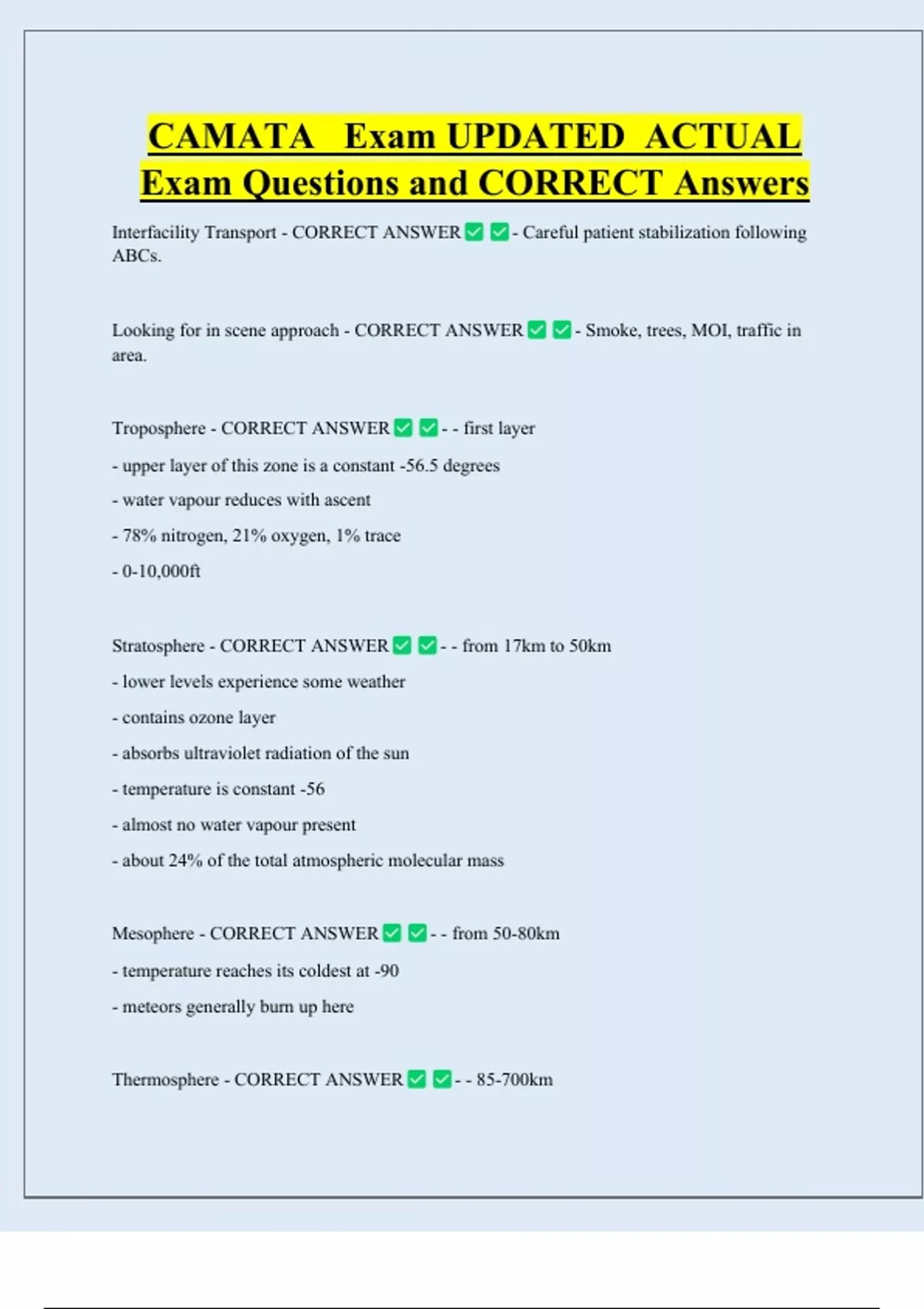 CAMATA Exam UPDATED ACTUAL Exam Questions and CORRECT Answers Interfacility Transport - CORRECT ANSWER ABCs. - Careful patient stabilization following Looking for in scene approach - CORRECT ANSWER area. Troposphere - CORRECT ANSWER - - first layer - upper layer of this zone is a constant -56.5 degrees - water vapour reduces with ascent - 78% nitrogen, 21% oxygen, 1% trace - 0-10,000ft Stratosphere - CORRECT ANSWER - Smoke, trees, MOI, traffic in