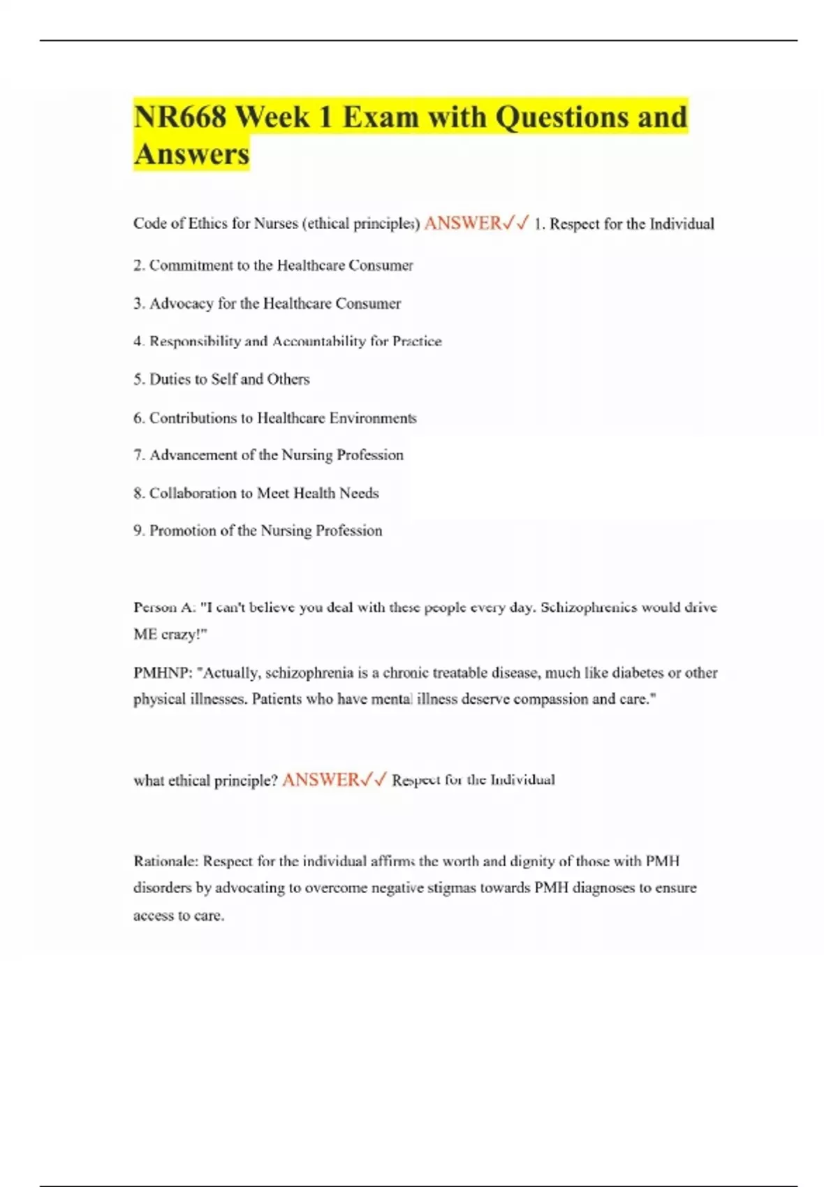 NR668 Week 1 Exam with Questions and Answers Code of Ethics for Nurses (ethical principles) ANSWER 1. Respect for the Individual 2. Commitment to the Healthcare Consumer 3. Advocacy for the Healthcare Consumer 4. Responsibility and Accountability for Practice 5. Duties to Self and Others 6. Contributions to Healthcare Environments 7. Advancement of the Nursing Profession 8. Collaboration to Meet Health Needs 9. Promotion of the Nursing Profession Person A: "I can't believe you deal with these people every day. Schizophrenics would drive ME crazy!" PMHNP: "Actually, schizophrenia is a chronic treatable disease, much like diabetes or other physical illnesses. Patients who have mental illness deserve compassion and care." what ethical principle? ANSWER Respect for the Individual Rationale: Respect for the individual affirms the worth and dignity of those with PMH disorders by advocating to overcome negative stigmas towards PMH diagnoses to ensure access to care.