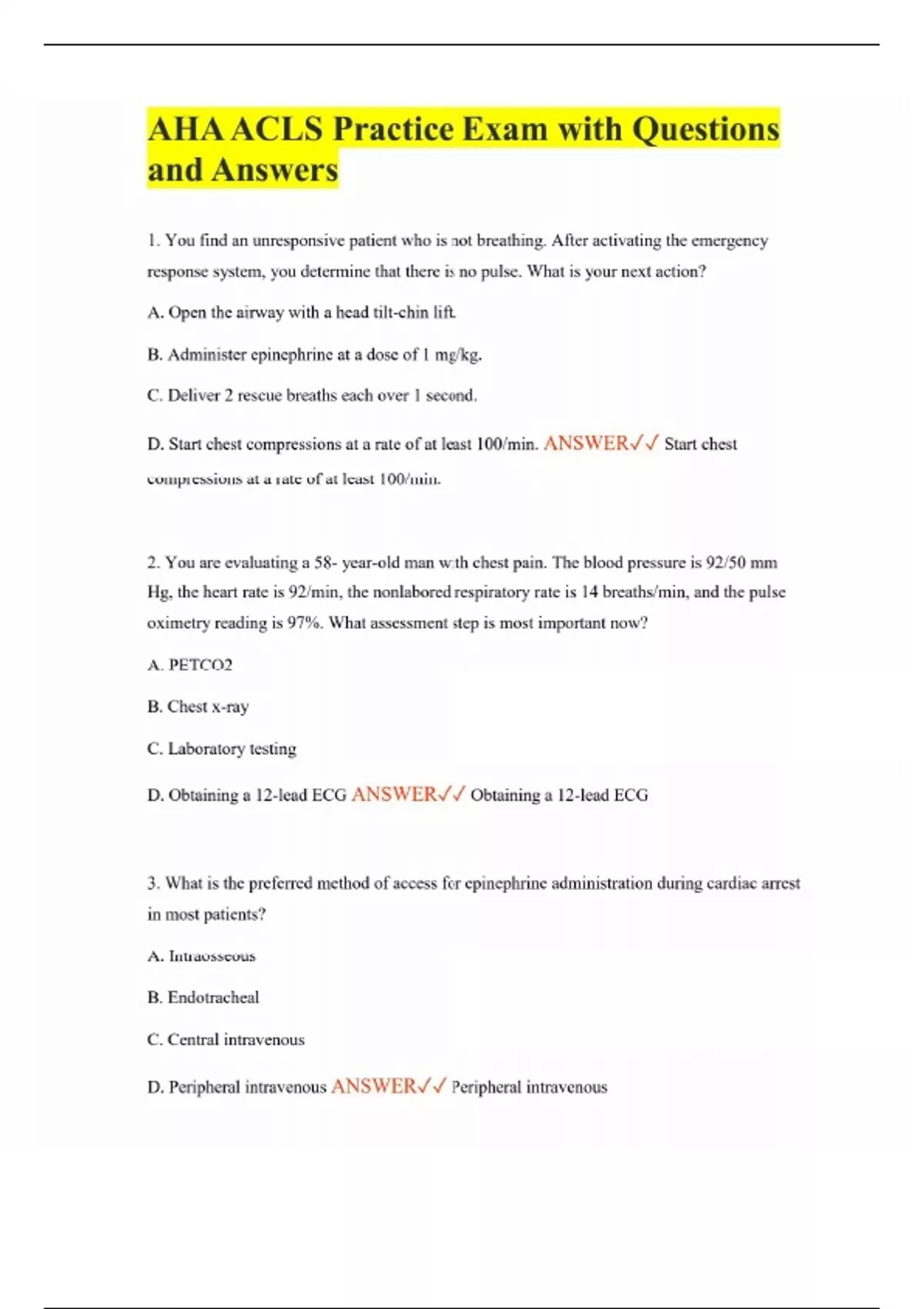 AHA ACLS Practice Exam with Questions and Answers 1. You find an unresponsive patient who is not breathing. After activating the emergency response system, you determine that there is no pulse. What is your next action? A. Open the airway with a head tilt-chin lift. B. Administer epinephrine at a dose of 1 mg/kg. C. Deliver 2 rescue breaths each over 1 second. D. Start chest compressions at a rate of at least 100/min. ANSWER Start chest compressions at a rate of at least 100/min. 2. You are evaluating a 58- year-old man with chest pain. The blood pressure is 92/50 mm Hg, the heart rate is 92/min, the nonlabored respiratory rate is 14 breaths/min, and the pulse oximetry reading is 97%. What assessment step is most important now? A. PETCO2 B. Chest x-ray C. Laboratory testing D. Obtaining a 12-lead ECG ANSWER Obtaining a 12-lead ECG 3. What is the preferred method of access for epinephrine administration during cardiac arrest in most patients? A. Intraosseous B. Endotracheal C. Central intravenous D. Peripheral intravenous ANSWER Peripheral intravenous