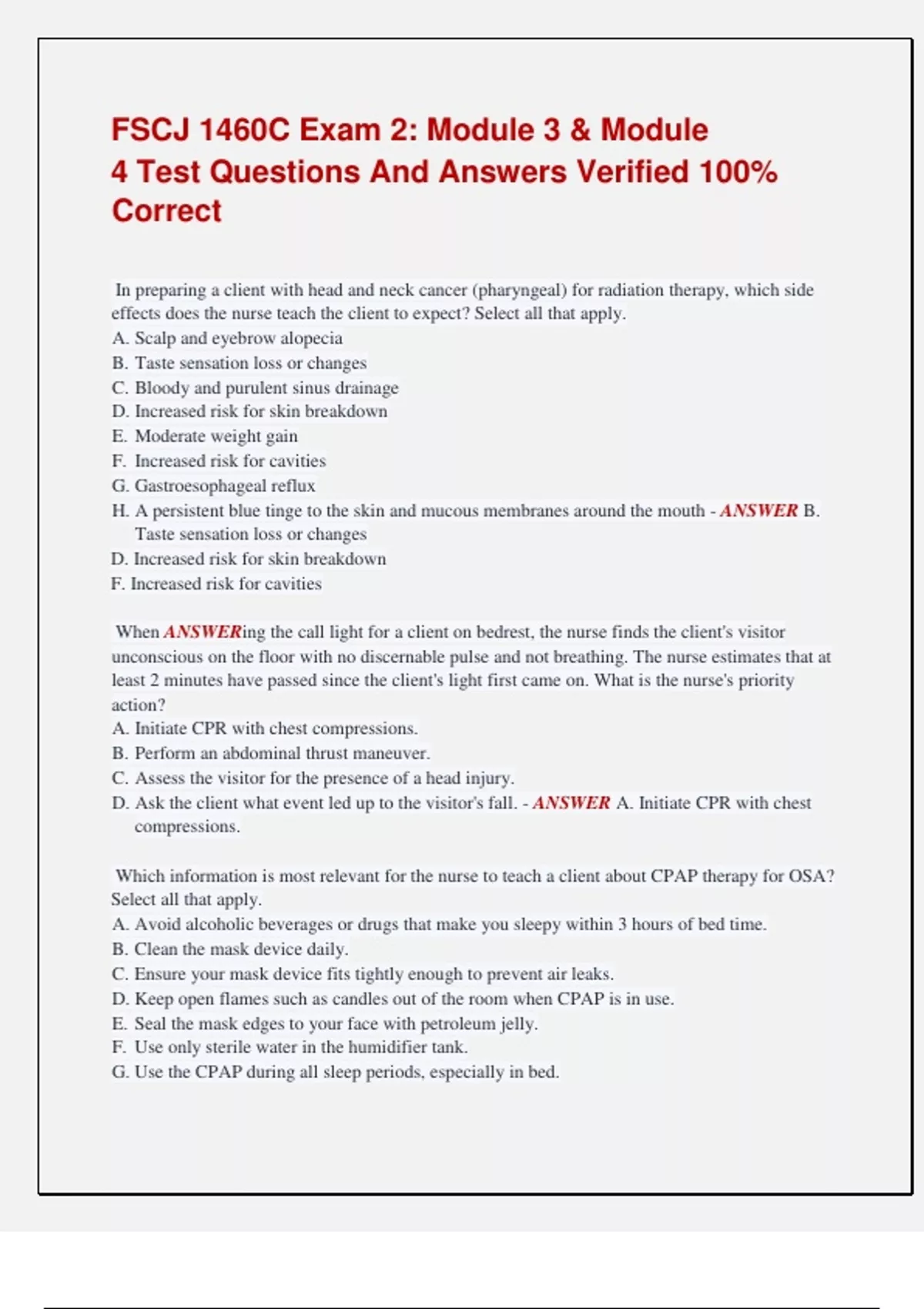 FSCJ 1460C Exam 2: Module 3 & Module 4 Test Questions And Answers Verified 100% Correct In preparing a client with head and neck cancer (pharyngeal) for radiation therapy, which side effects does the nurse teach the client to expect? Select all that apply. A. Scalp and eyebrow alopecia B. Taste sensation loss or changes C. Bloody and purulent sinus drainage D. Increased risk for skin breakdown E. Moderate weight gain F. Increased risk for cavities G. Gastroesophageal reflux H. A persistent blue tinge to the skin and mucous membranes around the mouth - ANSWER B. Taste sensation loss or changes D. Increased risk for skin breakdown F. Increased risk for cavities When ANSWERing the call light for a client on bedrest, the nurse finds the client's visitor unconscious on the floor with no discernable pulse and not breathing. The nurse estimates that at least 2 minutes have passed since the client's light first came on. What is the nurse's priority action? A. Initiate CPR with chest compressions. B. Perform an abdominal thrust maneuver. C. Assess the visitor for the presence of a head injury. D. Ask the client what event led up to the visitor's fall. - ANSWER A. Initiate CPR with chest compressions. Which information is most relevant for the nurse to teach a client about CPAP therapy for OSA? Select all that apply. A. Avoid alcoholic beverages or drugs that make you sleepy within 3 hours of bed time. B. Clean the mask device daily. C. Ensure your mask device fits tightly enough to prevent air leaks. D. Keep open flames such as candles out of the room when CPAP is in use. E. Seal the mask edges to your face with petroleum jelly. F. Use only sterile water in the humidifier tank. G. Use the CPAP during all sleep periods, especially in bed. H. Do not share your mask or tubing system with others. - ANSWER B. Clean the mask device daily. C. Ensure your mask device fits tightly enough to prevent air leaks. G. Use the CPAP during all sleep periods, especially in bed. H. Do not share your mask or tubing system with others. Which nursing action has the highest priority when caring for a client with any type of facial or laryngeal trauma? A. Managing pain B. Providing nutrition C. Assessing self-image D. Maintaining a patent airway - ANSWER D. Maintaining a patent airway A client who underwent radical neck surgery for head and neck cancer 5 days ago tells the nurse that he is worried because his right shoulder is lower than the left and does not go back into place when he tries to raise it. What is the nurse's best response? A. "I will notify the surgeon right away because some leftover tumor must be pressing on the nerve." B. "The nerve to the shoulder was removed during surgery. Physical therapy will help you to use other muscles to regain some motion." C. "This problem is not related to your surgery. If it persists after you go home you will need to see your primary health care provider about it." D. "Your time under anesthesia was long and you are not yet fully recovered. It is likely you will regain full motion in that shoulder by the end of the week." - ANSWER B. "The nerve to the shoulder was removed during surgery. Physical therapy will help you to use other muscles to regain some motion." The emergency department nurse is assessing a client who has sustained a blunt injury to the chest wall. Which finding indicates the presence of a pneumothorax in this client? a. A low respiratory rate b. Diminished breath sounds c. The presence of a barrel chest d. A sucking sound at the site of injury - ANSWER b. Diminished breath sounds The nurse is caring for a client hospitalized with acute exacerbation of chronic obstructive pulmonary disease. Which findings would the nurse expect to note on assessment of this client? Select all that apply. a. A low arterial PCo2 level b. A hyperinflated chest noted on the chest x-ray c. Decreased oxygen saturation with mild exercise d. A widened diaphragm noted on the chest x-ray e. Pulmonary function tests that demonstrate increased vital capacity - ANSWER b. A hyperinflated chest noted on the chest x-ray c. Decreased oxygen saturation with mild exercise The nurse is preparing a list of home care instructions for a client who has been hospitalized and treated for tuberculosis. Which instructions should the nurse include on the list? Select all that apply. a. Activities should be resumed gradually. b. Avoid contact with other individuals, except family members, for at least 6 months. c. A sputum culture is needed every 2 to 4 weeks once medication therapy is initiated. d. Respiratory isolation is not necessary, because family members already have been exposed. e. Cover the mouth and nose when coughing or sneezing and put used tissues in plastic bags. f. When 1 sputum culture is negative, the client is no longer considered infectious and usually can return to former employment. - ANSWER a. Activities should be resumed gradually. c. A sputum culture is needed every 2 to 4 weeks once medication therapy is initiated. d. Respiratory isolation is not necessary, because family members already have been exposed. e. Cover the mouth and nose when coughing or sneezing and put used tissues in plastic bags. The nurse is caring for a client after a bronchoscopy and biopsy. Which finding, if noted in the client, should be reported immediately to the primary health care provider? a. Dry cough b. Hematuria c. Bronchospasm d. Blood-streaked sputum - ANSWER c. Bronchospasm The nurse is assessing the respiratory status of a client who has suffered a fractured rib. The nurse should expect to note which finding? a. Slow, deep respirations b. Rapid, deep respirations c. Paradoxical respirations d. Pain, especially with inspiration - ANSWER d. Pain, especially with inspiration A client with a chest injury has suffered flail chest. The nurse assesses the client for which most distinctive sign of flail chest? a. Cyanosis b. Hypotension c. Paradoxical chest movement d. Dyspnea, especially on exhalat