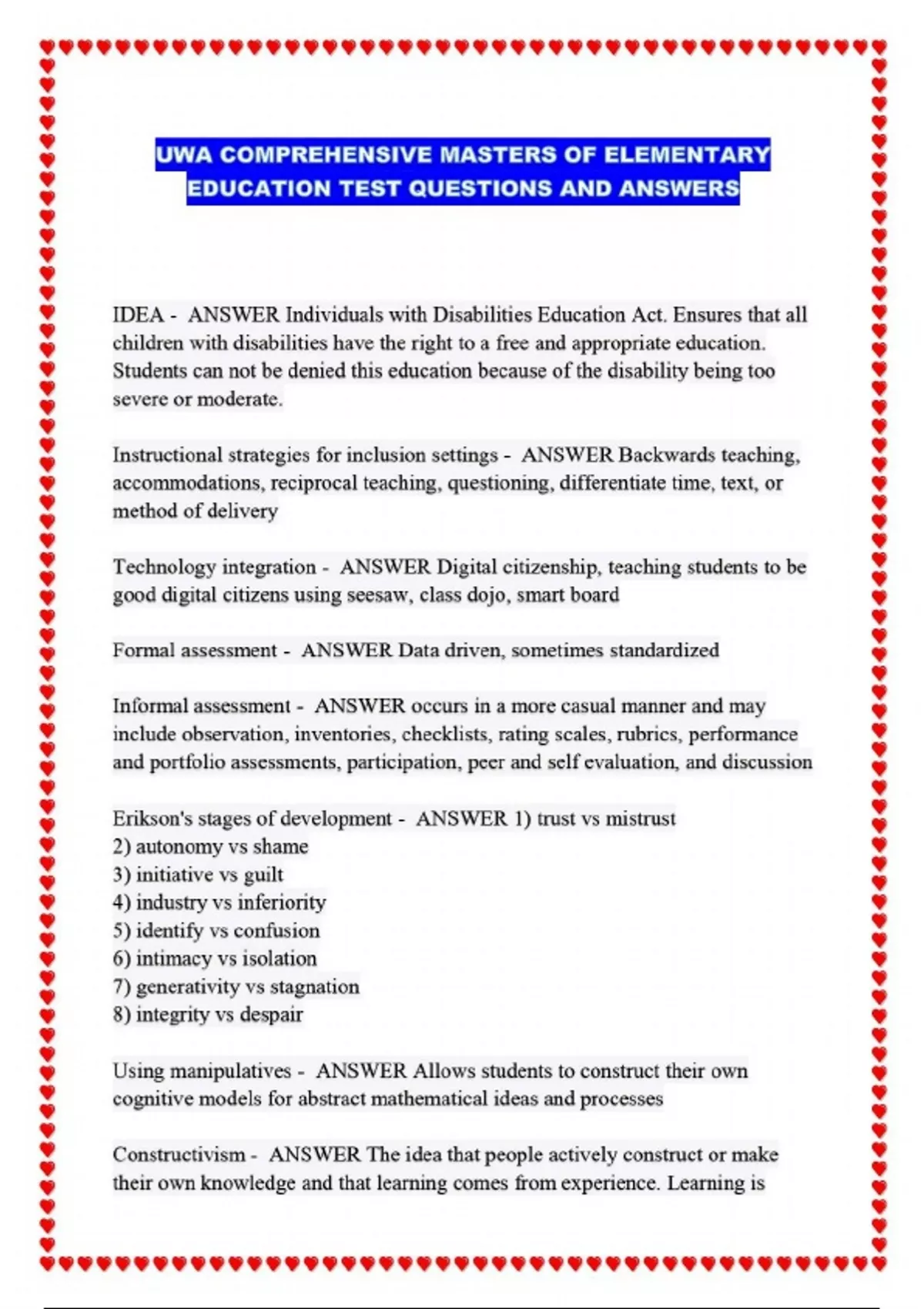 UWA COMPREHENSIVE MASTERS OF ELEMENTARY EDUCATION TEST QUESTIONS AND ANSWERS...