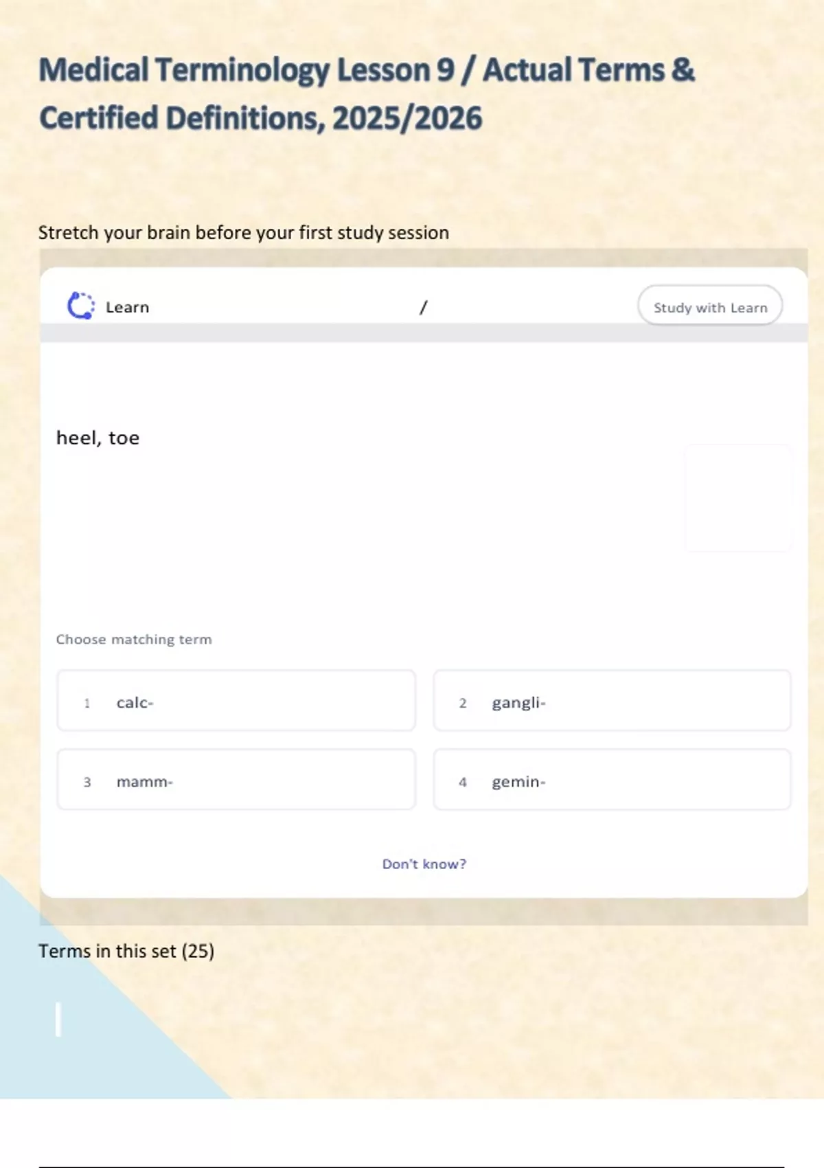 Medical Terminology Lesson 9 / Actual Terms & Certified Definitions, 2025/2026 Stretch your brain before your first study session Terms in this set (25) calc- heel, toe cheir- hand cine- move colla- glue